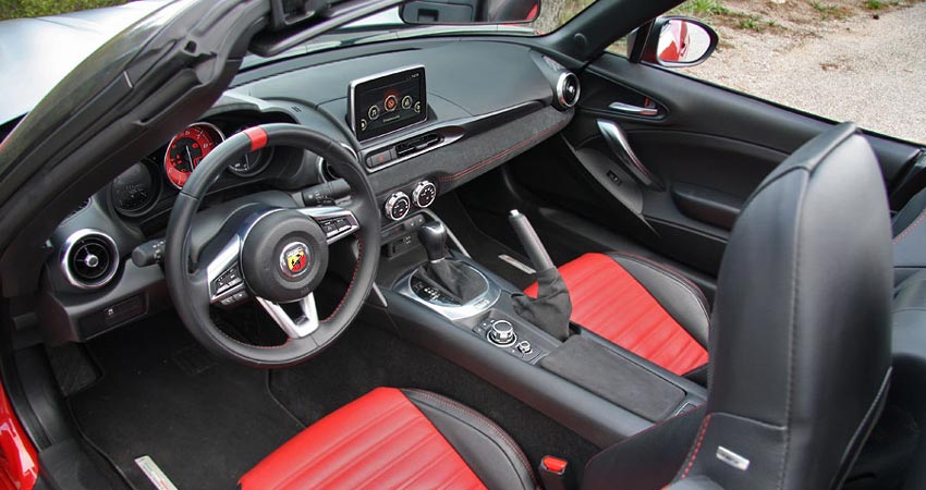 Στον αποκλειστικά διθέσιο θάλαμο των επιβατών, η Abarth φροντίζει ώστε να δημιουργήσει μια αρκετά σπορτίφ ατμόσφαιρα τοποθετώντας νέα μπάκετ καθίσματα σε κόκκινο-μαύρο δέρμα που προσφέρουν πολύ καλή στήριξη του σώματος, επενδύσεις από αλκαντάρα πάνω στο ταμπλό και την κεντρική κονσόλα με κόκκινες ραφές και σταμπαρισμένο τον σκορπιό της Abarth, αλλά και αλουμινένια πεντάλ. Το τιμόνι έχει μικρές διαστάσεις και διευκολύνει τη λαβή, ενσωματώνοντας και τα paddles αλλαγής σχέσεων, ενώ ο πίνακας οργάνων με κεντρικά τοποθετημένο στροφόμετρο σε κόκκινο χρώμα είναι όσο πιο «σπορ» γίνεται. Η θέση οδήγησης, με βάση τα δεδομένα των μικρών ρόουντστερ είναι αρκετά καλή, παρότι υψηλότεροι σε ύψος επιβάτες ίσως δυσκολευτούν να βρουν την επιθυμητή ρύθμιση μιας και το τιμόνι δεν ρυθμίζεται σε βάθος. Από πλευράς πρακτικότητας, λάμπουν δια τις απουσίας τους οι ποτηροθήκες, δεν υπάρχει ντουλαπάκι συνοδηγού (μόνο ένας αποθηκευτικός χώρος στο κέντρο πίσω από τα καθίσματα), ενώ ξενίζει όπως και στο Fiat 124 Spider, ο θόλος του κιβωτίου που κλέβει αρκετό χώρο από τα πόδια του συνοδηγού.
