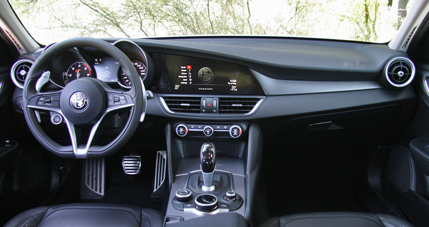 Η καμπίνα της Alfa Romeo Giulia δεν θα μπορούσε να μην ανταποκρίνεται στην ομορφιά του αμαξώματος. Ανοίγοντας την πόρτα βρίσκεσαι αντιμέτωπος με ένα τιμόνι που παραπέμπει σε… Ferrari, χάρη στο μπουτόν εκκίνησης που είναι ενσωματωμένο επάνω του, φτιάχνοντάς σου την διάθεση. Μία διάθεση που απογειώνεται με το που κάτσεις στην εξαιρετική θέση οδήγησης με το μεγάλο εύρος ρυθμίσεων. Οι γραμμές του ταμπλό είναι… καθαρές και λιτές, τα υλικά είναι σε κορυφαίο επίπεδο (πλην κάποιων ελαχίστων εξαιρέσεων) και η συναρμογή σε πείθει. Ο πίνακας οργάνων είναι ευανάγνωστος, ο περιστροφικός διακόπτης που θυμίζει BMW iDrive (είναι για τον έλεγχο του συστήματος πολυμέσων) προσθέτει πόντους στην πολύ καλή εργονομία και το χειριστήριο για το D.N.A. (με τα τρία προγράμματα οδήγησης) είναι εύκολα προσβάσιμο. Μοναδική εργονομική παραφωνία τα μεγάλα paddles πίσω από το τιμόνι τα οποία είναι σταθερά και μπορεί να διευκολύνουν τις αλλαγές σε γρήγορη οδήγηση και με το τιμόνι σε μεγάλη κλίση, εμποδίζουν όμως τη χρήση των χειριστηρίων για φλας και υαλοκαθαριστήρες (χρειάζεται μία μικρή εξοικείωση, μέχρι να συνηθίσεις τις αποστάσεις και να μην πέφτουν τα δάχτυλά σου σε λάθος σημείο). Όσον αφορά στους χώρους της Giulia, τέσσερις ενήλικες δεν θα έχουν θέμα, με το πίσω κάθισμα να είναι ακόμη και για τρεις ικανοποιητικό αλλά το μεγάλο τούνελ μετάδοσης κίνησης να κουράζει τον μεσαίο πίσω επιβάτη σε μεγάλες μετακινήσεις. Ο χώρος αποσκευών είναι στα 480 λίτρα, τιμή που δεν αφήνει χώρο… σε παράπονα, ενώ στο εσωτερικό υπάρχουν αρκετές θήκες για μικροαντικείμενα. Φάουλ η ύπαρξη της μίας ποτηροθήκης, με την δεύτερη ακριβώς δίπλα της να έχει χάσει την ικανότητά της να φιλοξενήσει ποτήρι, καθώς μέσα της οι Ιταλοί θεώρησαν σωστό να τοποθετήσουν τον αναπτήρα του αυτοκινήτου…