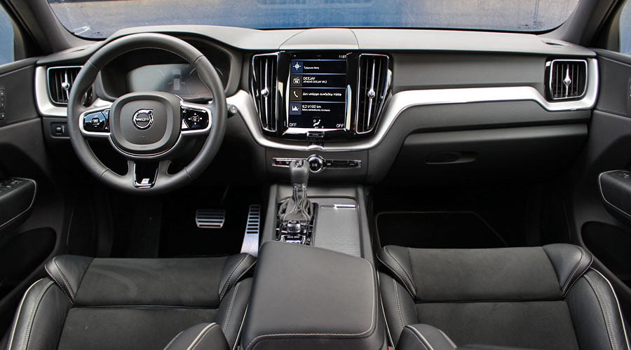 Στον θάλαμο των επιβατών του νέου Volvo XC60 κυριαρχεί η πολυτέλεια και η τεχνολογία. Βασικό στοιχείο αποτελεί η κάθετα τοποθετημένη κεντρική οθόνη αφής Sensus Connect των 9 ιντσών, όπου έχουν ενσωματωθεί πάρα πολλές λειτουργίες του αυτοκινήτου. Αρχικά ο οδηγός… πελαγώνει με το μενού της οθόνης μέχρι να μάθει που βρίσκεται το κάθε τι, ωστόσο μετά από λίγη ώρα μπορεί και χειρίζεται σχετικά εύκολα τα βασικά, αν και κάποια μπουτόν παραπάνω θα βελτίωναν την εργονομία. Την high-tech εικόνα ενισχύει και ο ψηφιακός πίνακας οργάνων των 12 ιντσών, ο οποίος αλλάζει γραφικά και παρέχει πληθώρα πληροφοριών. Από πλευράς κατασκευής έχει γίνει ευρεία χρήση μαλακών υλικών στο ταμπλό και στις πόρτες, η συναρμογή και το φινίρισμα είναι προσεγμένα, αλλά όχι κορυφαία για την κατηγορία των μεσαίων premium SUV. Κανένα παράπονο δεν θα υπάρξει από τους επιβάτες σε επίπεδο χώρων αφού είναι σε θέση να φιλοξενηθούν πέντε άτομα χωρίς να στριμωχτούν, ενώ μεγάλο, αλλά ρηχό είναι και το πορτμπαγκάζ των 505 λίτρων.