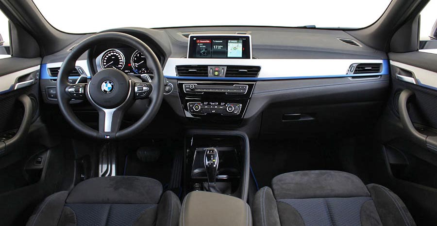 Το εσωτερικό της BMW X2 σίγουρα ως ένα βαθμό επηρεάζεται από τον σχεδιασμό του αμαξώματος. Έτσι, οι μεγάλες μεταλλικές επιφάνειες, που δεν αφήνουν πολύ χώρο στα τζάμια, σε συνδυασμό με την κυριαρχία του μαύρου χρώματος στην καμπίνα, σε κάνουν να νιώθεις πως πρόκειται για μία σπορ κατασκευή. Τα υλικά είναι κορυφαία και η συναρμογή τους επίσης και σου δημιουργούν τη βεβαιότητα πως όσο ήλιο, σκόνη και… κοπάνημα και να φάνε, δεν θα τρίξουν και δεν θα χαλάσουν ποτέ. Ο πίνακας οργάνων αποτελείται από δύο μεγάλα κυκλικά όργανα για στροφόμετρο και ταχύμετρο, ενώ στο κέντρο του ταμπλό ψηλά κυριαρχεί η οθόνη του συστήματος πολυμέσων με το πιεζοπεριστροφικό χειριστήριο για το iDrive Πιο κάτω της βρίσκονται σε στοίχιση οι αεραγωγοί, το ηχοσύστημα και το πάνελ χειρισμού του κλιματισμού. Στην περίπτωση του δικού μας αυτοκινήτου βέβαια υπήρχαν και τα αξεσουάρ της M, όπως το τριάκτινο τιμόνι με τα χειριστήρια και τα paddles για τις αλλαγές ταχυτήτων και τα μπάκετ καθίσματα. Όσον αφορά στους χώρους της καμπίνας, η X2 είναι ικανή να φιλοξενήσει χωρίς πρόβλημα τέσσερις ενήλικες, με το μεσαίο στο πίσω να μην είναι… καλοδεχούμενος λόγω υψηλού τούνελ δαπέδου. Η πρακτικότητα είναι σε καλό επίπεδο με αρκετές και ευρύχωρες θήκες για μικροαντικείμενα, τσέπες στις πόρτες και ποτηροθήκες σε σωστά σημεία και με σωστό βάθος και διάμετρο. Ο χώρος αποσκευών είναι στα 470 λίτρα και με την αναδίπλωση των πίσω καθισμάτων φτάνει στα 1.355 λίτρα, με το σχήμα του να είναι εκμεταλλεύσιμο καθώς οι θόλοι δεν εισβάλουν σε αυτόν.