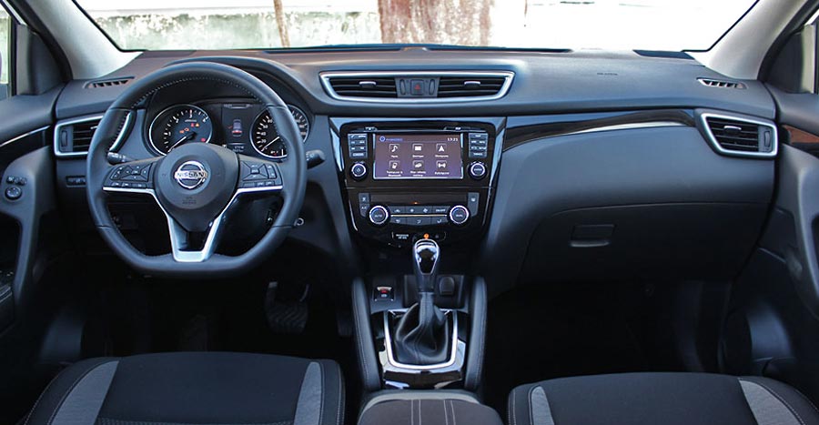 Το εσωτερικό του Nissan Qashqai ικανοποιεί πλήρως με την ποιότητά του. Είναι προσεγμένο και αναβαθμίζεται σημαντικά από τη χρήση μαλακού υλικού στο ταμπλό, τόσο στο πάνω μέρος του, όσο και πιο χαμηλά. Η θέση οδήγησης έχει μεγάλο εύρος ρυθμίσεων, η εργονομία είναι μελετημένη και δεν απαιτείται μεγάλο διάστημα εξοικείωσης, ενώ η περιμετρική ορατότητα είναι πολύ καλή. Από πλευράς χώρων, το εσωτερικό του Qashqai είναι σε θέση να φιλοξενήσει 4 ενήλικες άνω του μεσαίου αναστήματος, αφού στο πίσω κάθισμα θα βολευτούν χωρίς ιδιαίτερο πρόβλημα μέχρι τρεις ενήλικες μεσαίου αναστήματος. Χώροι για μικροαντικείμενα υπάρχουν αρκετοί και σε επίκαιρες θέσεις, ενώ ο χώρος αποσκευών με το διπλό δάπεδο και το μεγάλο άνοιγμα έχει χωρητικότητα 430 λίτρα.