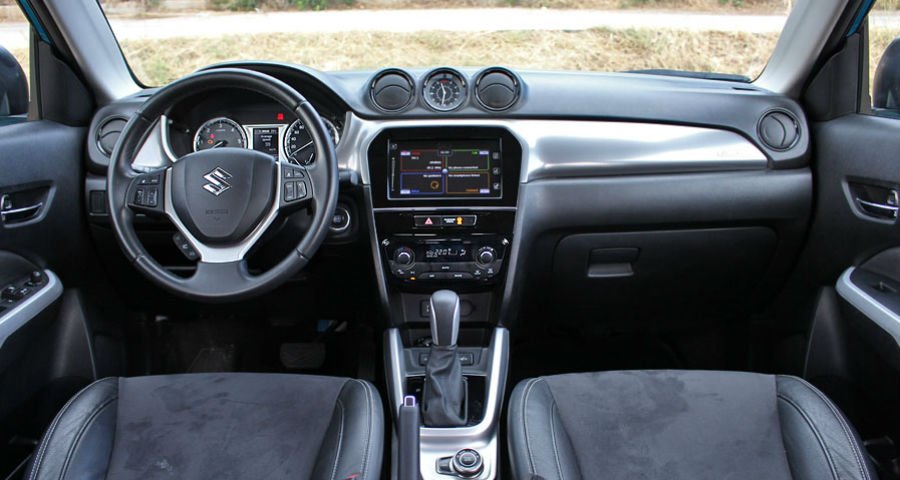 Ανάλογο το ύφος και στο εσωτερικό του Vitara. Η χρηστικότητα και η αντοχή στο χρόνο υπερτερούν της επιθυμίας για «αφρό» στο ταμπλό, χωρίς αυτό να σημαίνει πως τα πλαστικά που χρησιμοποιούνται είναι υπό του μέσου όρου. Το αντίθετο, θα λέγαμε. Μπορεί τα υλικά να είναι σκληρά, όμως η ποιότητα συναρμογής τους σε προϊδεάζει πως θα αντέξουν για «μια ζωή». Η σχεδίαση, μάλιστα, κάθε άλλο παρά αδιάφορη εμφανίζεται με τους κυκλικούς αεραγωγούς και το αναλογικό ρολόι ανάμεσά τους, συνοδεία της οθόνης αφής 7 ιντσών για τον έλεγχο των λειτουργιών του συστήματος πολυμέσων. Η τελευταία, μαζί με τις επενδύσεις δέρματος-alcantara στα καθίσματα, αποτελούν προνόμιο της κορυφαίας έκδοσης GLX. Ανεξαρτήτως εξοπλιστικού επιπέδου, οι χώροι είναι πέρα για πέρα ικανοποιητικοί ακόμα και για πέντε άτομα, με το μεσαίο ωστόσο να χρειάζεται να κάνει κάποιες παραχωρήσεις. Το πορτμπαγκάζ των 375 λίτρων είναι ικανοποιητικό, δεδομένων των εξωτερικών διαστάσεων, ενώ το μεγάλο άνοιγμα και το πλήρως εκμεταλλεύσιμο σχήμα μεγιστοποιούν την αξιοποίηση της χωρητικότητας.