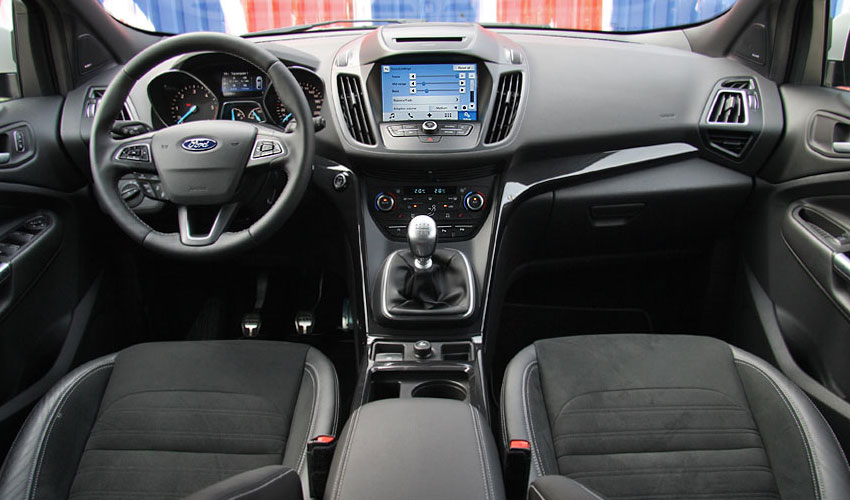 Στο εσωτερικό του ανανεωμένου Kuga η Ford βελτίωσε την εργονομία, ενώ παράλληλα αναβάθμισε σε τεχνολογία τα διάφορα συστήματά του. Αρχικά ξεχωρίζει το νέο τιμόνι που περιλαμβάνει πιο εύχρηστα πλήκτρα χειρισμού και κατόπιν το νέας γενιάς σύστημα πολυμέσων SYNC 3, με εντελώς καινούργιο λειτουργικό, στάνταρ σκληρό δίσκο χωρητικότητας 64 GB και σύστημα πλοήγησης. Νέα είναι ακόμα τα χειριστήρια για τον κλιματισμό και το πρακτικό ηλεκτρικό χειρόφρενο, που αφήνει περισσότερο χώρο για μικροαντικείμενα. Το Kuga ST-Line εφοδιάζεται με σπορ καθίσματα με μερική επένδυση δέρματος και ραφές αντίθετου χρώματος στον επιλογέα ταχυτήτων και τιμόνι, μαύρη οροφή και διακοσμητικό μεταλλικού χρώματος στην κονσόλα. Σε επίπεδο ποιότητας κατασκευής, τα μαλακά πλαστικά στο ταμπλό και τα επιμέρους σκληρά είναι πολύ καλά, ωστόσο στον τομέα του φινιρίσματος και συναρμογής υπάρχουν περιθώρια βελτίωσης. Από πλευράς χώρων, το εσωτερικό του Kuga θα φιλοξενήσει με άνεση έως πέντε ενήλικους επιβάτες μαζί με τις αποσκευές τους (456 λτ.).
