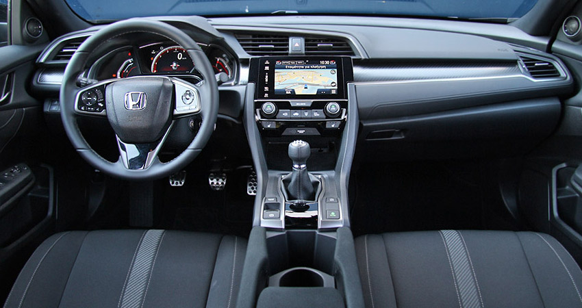 Όπως το αμάξωμα, έτσι και το εσωτερικό του νέου Civic είναι πλήρως βελτιωμένο, με καλύτερη εργονομία, μεγαλύτερους χώρους και πιο σύγχρονη τεχνολογία. Ποιοτικά είναι συνολικά προσεγμένο τόσο σε υλικά, όσο σε φινίρισμα και συναρμογή. Μαλακά πλαστικά συναντώνται στο μεγαλύτερο μέρος του ταμπλό και στο πάνω μέρος των εμπρός θυρών, ωστόσο αυτό που θα ήθελαν ίσως κάποιοι, είναι πιο premium εικόνα, δεδομένης της τιμής του αυτοκινήτου. Στο νέο Civic ο ψηφιακός πίνακας οργάνων (κόκκινες ενδείξεις στην έκδοση Sport) είναι πλέον ενιαίος και πιο ευανάγνωστος (αντί του διπλού που υπήρχε πριν), ενώ ο οδηγός κάθεται πιο βολικά, χάρη στο πιο χαμηλά τοποθετημένο κάθισμα κατά 35 χλστ. Πιο εύκολο στην χρήση είναι με την σειρά του και το νέας γενιάς σύστημα πολυμέσων Honda Connect με την έγχρωμη οθόνη αφής των 7 ιντσών.
