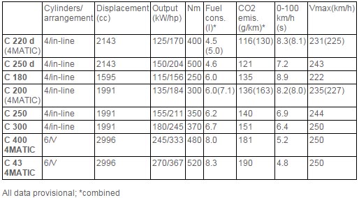Στους κινητήρες υπάρχουν έξι μηχανικά σύνολα βενζίνης από 1.600 κ.εκ. έως 3.000 κ.εκ. με ισχύ από 156 έως 367 ίππους και στους ντίζελ υπάρχουν δύο εκδόσεις στα 2.15 λτ. με 170 ή 204 ίππους. Όλα τα μοτέρ συνδυάζονται και με το αυτόματο κιβώτιο ταχυτήτων 9G-TRONIC, ενώ την τετρακίνηση 4MATIC περιλαμβάνουν στάνταρ οι εκδόσεις C 400 4MATIC, C 43 4MATIC και προαιρετικά οι C 220 d και C 200.