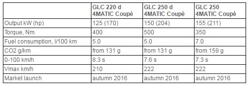 Για την κίνηση της GLC Coupé θα προσφέρονται αρχικά (το φθινόπωρο του 2016) τρία μηχανικά σύνολα, τα ντίζελ των 2.2 λτ. ισχύος 170 και 204 ίππων και το 2λιτρο βενζίνης των 211 ίππων (βλ. παρακάτω τεχνικά χαρακτηριστικά). Προς τα τέλη του 2016 θα προστεθούν και άλλες εκδόσεις, μεταξύ των οποίων η υβριδική GLC 350 e 4MATIC Coupé με συνδυαστική ισχύ 320 ίππων, εκπομπές CO2 από 59 γρ.χλμ., 0-100 χλμ./ώρα σε 5,9 δλ. και δυνατότητα κίνησης μόνο με την χρήση της ηλεκτρικής ενέργειας για αποστάσεις πάνω από 30 χιλιόμετρα. Επίσης, θα υπάρξει και η πιο ισχυρή Mercedes-AMG GLC 43 4MATIC Coupé με το V6 biturbo3.0 λτ. μοτέρ των 367 ίππων, το οποίο θα προσφέρει επιτάχυνση στα 0-100 χλμ./ώρα σε λιγότερο από 5 δευτερόλεπτα.