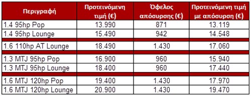 | Έκδοση | 1.4 95 HP | 1.6 110 HP | 1.3 96 HP MJET | 1.6 120 HP MJET |