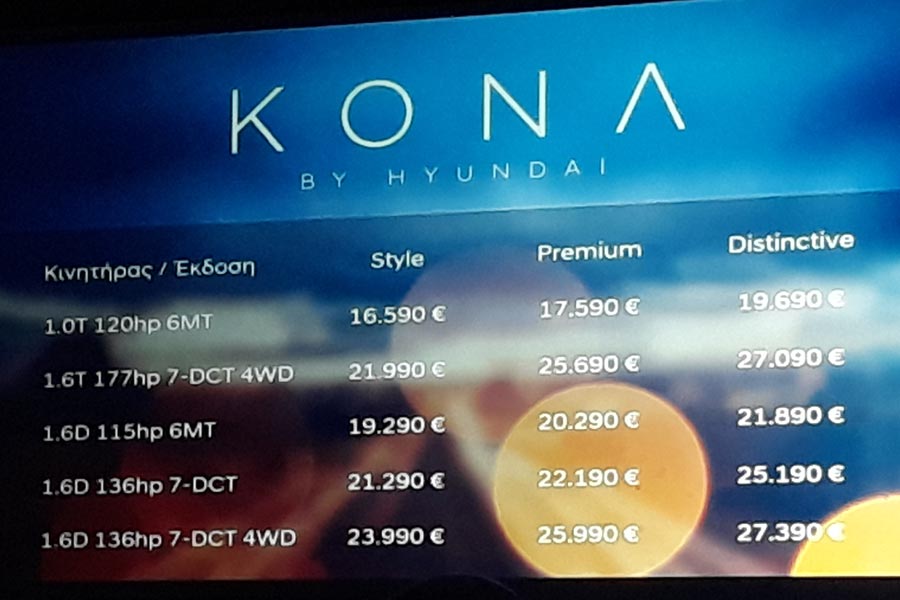 Το Hyundai ΚΟΝΑ λανσάρεται με μία από τις καλύτερες τιμές στην κατηγορία. Συγκεκριμένα η βασική έκδοση Style ξεκινάει από τις 16.590 ευρώ, ούσα βασική μόνο κατ’ όνομα. Ο εξοπλισμός περιλαμβάνει -μεταξύ άλλων- 8 αερόσακους, ΕSP και το πακέτο τεχνολογίας Hyundai SmartSense, που περιλαμβάνει συστήματα διατήρησης πορείας και αλλαγής λωρίδας, start-stop, υποβοήθηση εκκίνησης σε ανηφόρα και προειδοποίηση επικείμενης πρόσκρουσης. Στον εξοπλισμό άνεσης δεν λείπουν τα ηλεκτρικά παράθυρα εμπρός-πίσω, οι ηλεκτρικοί καθρέπτες, η ρύθμιση του τιμονιού σε ύψος και βάθος, το cruise control, το ηχοσύστημα με οθόνη TFT 4,0 ιντσών, ακόμα μία οθόνη 3,5 ιντσών στον πίνακα οργάνων για την παρακολούθηση των υπολοίπων λειτουργιών του αυτοκινήτου, αλλά και ζάντες αλουμινίου 16 ιντσών.