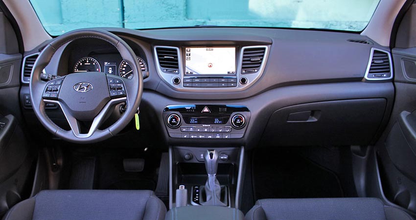 Στο εσωτερικό του νέου Tucson η Hyundai δίνει έμφαση στην πρακτικότητα και την πολύ καλή ευρυχωρία, ενώ παράλληλα οι σχεδιαστές της έχουν δημιουργήσει ένα ταμπλό με όμορφες, καθαρές γραμμές, στο οποίο τις εντυπώσεις κλέβει η ψηλά τοποθετημένη έγχρωμη οθόνη αφής 8 ιντσών, που διαθέτει και περιστροφικά χειριστήρια στη βάση της. Τα υλικά που έχουν κατασκευαστεί είναι ως επί το πλείστον σκληρά στην αφή, με πολύ καλή συναρμογή, ενώ μαλακό πλαστικό συναντάται μόνο στο ανώτερο οριζόντιο κεντρικό τμήμα του ταμπλό. Από την άλλη, άφθονες είναι οι θήκες για μικροαντικείμενα στην κεντρική κονσόλα, το εσωτερικό των θυρών, ενώ υπάρχει και το απαραίτητο ντουλαπάκι του συνοδηγού. Άνετοι είναι οι χώροι στο πίσω κάθισμα του αυτοκινήτου, με το διαθέσιμο πλάτος να βολεύει στη μεταφορά 3 ενηλίκων επιβατών. Προσόν της πλάτης του πίσω καθίσματος αποτελεί και το γεγονός ότι μπορεί να ρυθμιστεί και η κλίση της, ενώ διαιρείται και σε ποσοστό 60:40. Την όλη πρακτικότητα της επιλογής τονίζει και η πολύ καλή χωρητικότητα του πορτ-μπαγκάζ, η οποία βρίσκεται στα 488 λίτρα. Μάλιστα, ακριβώς κάτω από το δάπεδο, υπάρχει και στάνταρ ρεζέρβα κανονικών διαστάσεων.