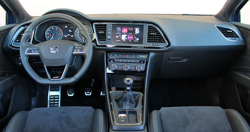 Στην καμπίνα των επιβατών του Leon CUPRA το πρώτο στοιχείο που ξεχωρίζει είναι η αρτιότητα στην ποιότητα κατασκευής και η γενικότερη επιλογή των υλικών (π.χ. άφθονο μαλακό πλαστικό σε ταμπλό και εσωτερικό θυρών), που τονίζουν τον ποιοτικό χαρακτήρα του αυτοκινήτου. Παράλληλα, υπάρχουν και οι απαραίτητες σπορ επεμβάσεις, όπως είναι το τιμόνι με το επίπεδο κάτω τμήμα και το ειδικό λογότυπο, τα αλουμινένια πεντάλ, αλλά και οι επενδύσεις με δέρμα και αλκαντάρα στα καθίσματα και το κάτω τμήμα των θυρών, που συμπληρώνονται και με σπορ μοτίβο ανθρακονημάτων. Προσόν της καμπίνας του ανανεωμένου Leon CUPRA αποτελεί και η στάνταρ παρουσία του αναβαθμισμένου συστήματος πολυμέσων Media System Plus με οθόνη αφής 8 ιντσών, που ενσωματώνει και το CUPRA Drive Profile, με τις επιλογές των οδηγικών προφίλ Comfort, Sport, CUPRA και Individual.