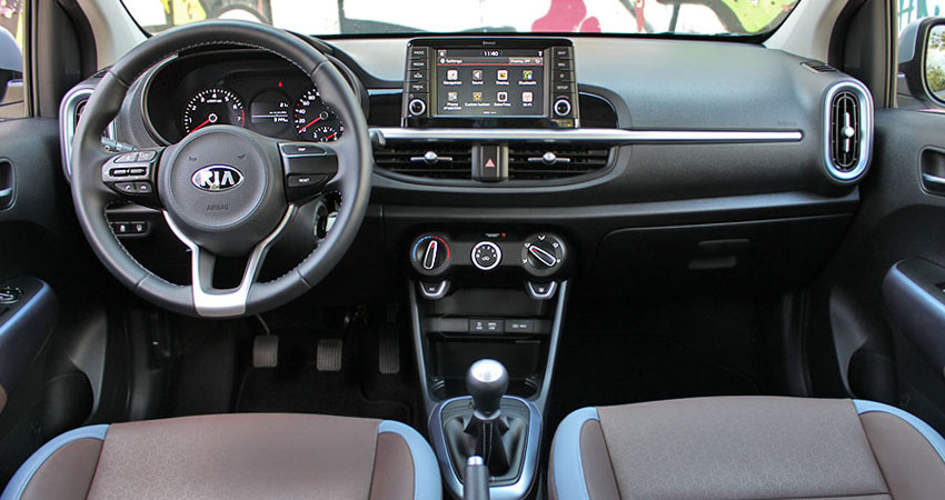 Εντελώς νέο είναι και το εσωτερικό του τρίτης γενιάς Kia Picanto, το οποίο κερδίζει αμέσως τις εντυπώσεις με τα πολύ καλά συνολικά του χαρακτηριστικά σε κάθε επίπεδο. Το ταμπλό με τις καμπύλες επιφάνειες και την οριζόντια σατινέ γραμμή απέκτησε σημαντικά πιο μοντέρνο σχεδιασμό, που ενισχύουν με την σειρά τους το σπορτίφ τιμόνι και ο νέος, ευανάγνωστος και πλήρης ενδείξεων πίνακας οργάνων. Στο κέντρο του ταμπλό κυριαρχεί η οθόνη αφής των 7 ιντσών του συστήματος πολυμέσων (στάνταρ στις πιο πλούσιες εκδόσεις Ex Premium και GT-Line). Πολύ καλή είναι και η ποιότητα των σκληρών πλαστικών με την στιβαρή συναρμογή και το προσεγμένο φινίρισμα, χωρίς να υπάρχουν πουθενά ακάλυπτες μεταλλικές επιφάνειες, όπως συμβαίνει σε ανταγωνιστικά μοντέλα. Παράλληλα, ο οδηγός του νέου Picanto θα βρει εύκολα την κατάλληλη θέση και δεν θα αντιμετωπίσει κανένα πρόβλημα με την εργονομία. Την πρακτικότητα ενισχύουν με την σειρά τους οι πολλές θέσεις για μικρά ή μεγαλύτερα αντικείμενα που υπάρχουν στην κονσόλα και στις εμπρός πόρτες. Στα πλεονεκτήματα του εσωτερικού του νέου Picanto ανήκουν ακόμα οι άνετοι χώροι για 4 επιβάτες και το μεγάλο πορτ μπαγκάζ των 255 λίτρων (έναντι 200 λτ. στο προγενέστερο Picanto).
