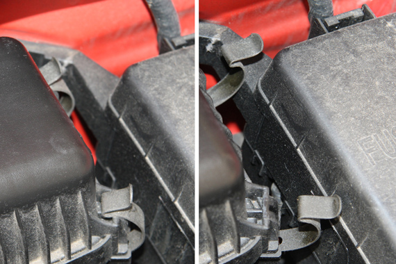 1. Ανοίγουμε το καπό του κινητήρα και εντοπίζουμε το φιλτροκούτι. Συνήθως πρόκειται για ένα μαύρο κουτί που αποτελείται από δύο τμήματα, τα οποία στα περισσότερα αυτοκίνητα ενώνονται με κλιπ ή με βίδες.