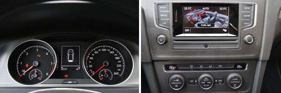 Ο θάλαμος επιβατών του νέου Golf κερδίζει αμέσως τις πρώτες εντυπώσεις με την πολύ καλή ποιότητα κατασκευής του και όχι με την άτολμη και συντηρητική του σχεδίαση, που «συνηθίζεται» γρήγορα. Το παχύ αφρώδες υλικό που καλύπτει ολόκληρο το πάνω μέρος του ταμπλό, η άψογη συναρμογή μεταξύ των επιμέρους επιφανειών και το προσεγμένο φινίρισμα συνθέτουν ένα αποτέλεσμα, το οποίο ενισχύει περεταίρω την όλη στιβαρή εικόνα που εισπράττει κανείς από το αυτοκίνητο. Παράλληλα «τυπικά» για Golf, ο οδηγός θα βρει εύκολα την κατάλληλη θέση μέσω και των πολλαπλών ρυθμίσεων σε κάθισμα και τιμόνι, τα επιμέρους χειριστήρια είναι σωστά τοποθετημένα, ενώ δεν λείπουν οι απαραίτητες θήκες για μικρά και πιο μεγάλα αντικείμενα, καθώς και για ποτήρια. Βελτιωμένοι με την σειρά τους παρουσιάζονται οι διαθέσιμοι χώροι για τους επιβάτες και τις αποσκευές, αφού ο αέρας για τα γόνατα των πίσω φιλοξενούμενων δε διαφέρει από μεσαίου αυτοκινήτου και ο χώρος αποσκευών με το διπλό δάπεδο μεγάλωσε κατά 30 λίτρα, φτάνοντας τα 380 λίτρα.