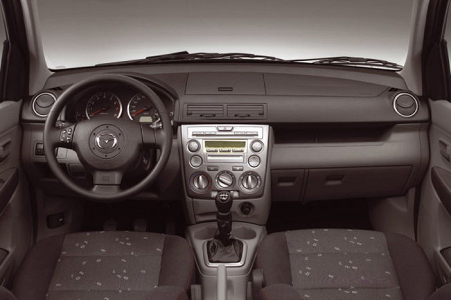 Το πρώτης γενιάς Mazda2 παρουσίαζε χαρακτηριστικά μικρού MPV αυτοκινήτου με το σχετικά ψηλό του αμάξωμα, ωστόσο δεν έλλειπαν κάποια σπορτίφ στοιχεία στην σχεδίασή του εξωτερικά αλλά και στο εσωτερικό. Σε αυτό θετικά κρίνεται η ποιότητα των σκληρών πλαστικών και της συναρμολόγησης των επιμέρους επιφανειών, όπως και η εργονομία των διαφόρων χειριστηρίων αλλά και η βολική θέση οδήγησης. Επιπλέον στο εσωτερικό του Mazda2 οι φιλοξενούμενοι έχουν στη διάθεσή τους αρκετό ωφέλιμο πλάτος και αέρα για τα γόνατα και τα κεφάλια. Ο δε ο χώρος αποσκευών των 267 λτ. είναι πρακτικός χάρη στο μεγάλο άνοιγμα της πόρτας και το χαμηλό κατώφλι φόρτωσης.
