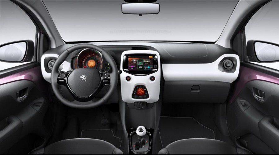Στον θάλαμο των επιβατών του 108 στα στοιχεία που προσελκύουν το ενδιαφέρον είναι η μεγάλη οθόνη των 7 ιντσών του συστήματος πολυμέσων Mirror Screen, η οποία συνδέεται και με την κάμερα οπισθοπορείας. Ο νέος πίνακας οργάνων με το μεγάλο ταχύμετρο ενσωματώνει στο κέντρο το trip computer, ενώ αριστερά υπάρχει το στροφόμετρο. Το νεανικό χαρακτήρα του εσωτερικού ενισχύουν οι χρωματιστές επενδύσεις στο ταμπλό, ωστόσο όπως και στο 107 διατηρήθηκαν οι γυμνές μεταλλικές επιφάνειες στις πόρτες στο χρώμα του αμαξώματος, τα πίσω παράθυρα που ανοίγουν μόνο προς τα έξω και τα εμπρός καθίσματα έχουν ενιαία πλάτη, δίχως ρυθμιζόμενο προσκέφαλο. Από πλευράς εργονομίας σημαντική είναι η προσθήκη και δεύτερου διακόπτη στην πόρτα του οδηγού για τον χειρισμό και του παραθύρου του συνοδηγού. Όσον αφορά στους διαθέσιμους χώρους το πορτ μπαγκάζ μεγάλωσε στα 196 λίτρα ή 180 λτ. με κανονική ρεζέρβα (έναντι 139 λτ. του 107).