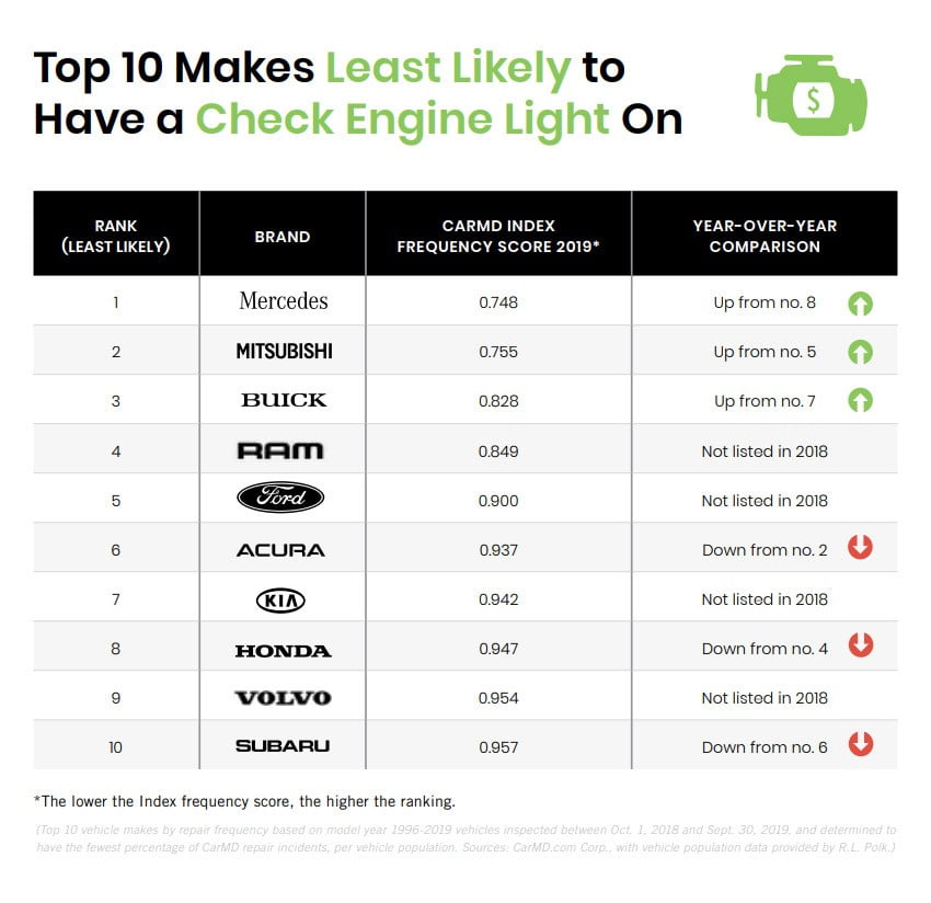 Στην πρώτη θέση της συνολικής κατάταξης βρέθηκε η Mercedes, ενώ ακολούθησαν οι μάρκες Mitsubishi, Buick, Ram και Ford. Όσον αφορά τα μοντέλα, το check engine έκανε λιγότερες φορές την εμφάνισή του στα Honda CR-V 2017, Subaru Outback 2017, Lexus NX 2016, Subaru Legacy 2017 και Honda Civic 2017.