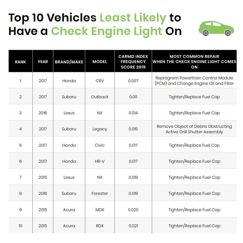 Η εταιρεία CarMD ανακοίνωσε την ετήσια έκθεσή της σχετικά με την αξιοπιστία των αυτοκινήτων στις Η.Π.Α. Η ανάλυση προέκυψε εξετάζοντας πάνω από 14,4 εκατομμύρια αυτοκίνητα, μοντέλα από το 1995 έως το 2018, στα οποία άναψε η ένδειξη του check engine το διάσημα μεταξύ 1 Οκτωβρίου 2018 μέχρι 30 Σεπτεμβρίου 2019.