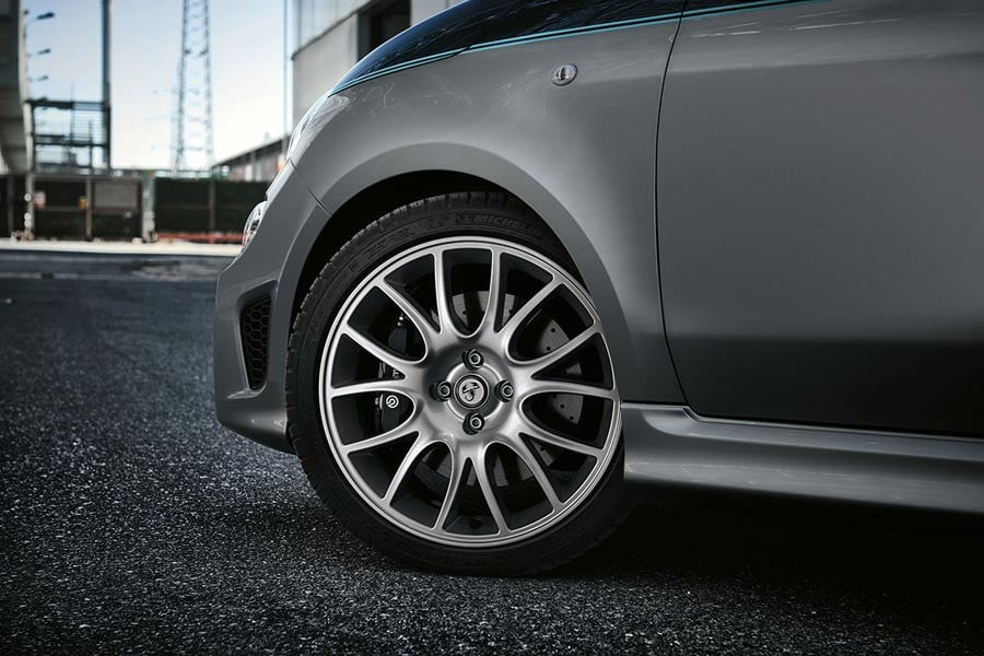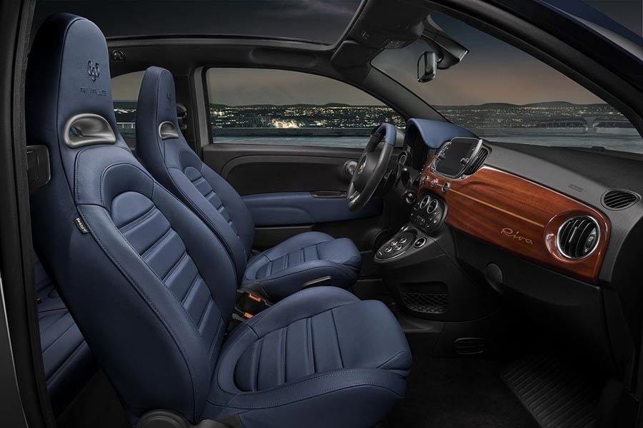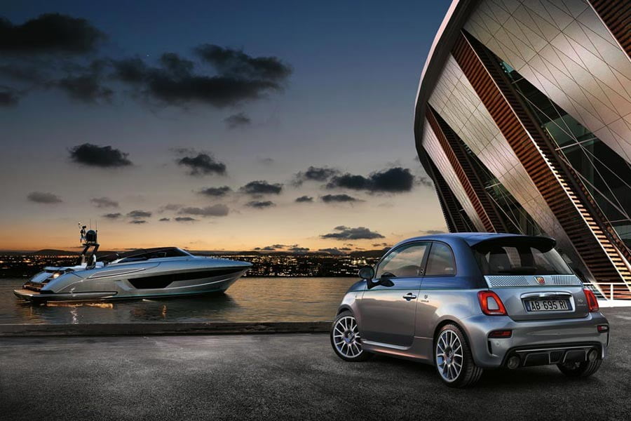 Το μίνι δυναμικό και στιλάτο Abarth είναι άμεσα αναγνωρίσιμο χάρη στην αποκλειστική διχρωμία του αμαξώματος μπλε και γκρι Riva, με τα δύο χρώματα να χωρίζονται από μια λεπτή γραμμή aquamarine, που θυμίζει την “ίσαλο γραμμή” στα σκάφη. Ξεχωριστά του στοιχεία αποτελούν ακόμα το χρωμιωμένο φινίρισμα στις λαβές, το λογότυπο “695 Rivale” στην πόρτα αποσκευών και στους πίσω προφυλακτήρες, το χρωμιωμένο διακοσμητικό ένθετο στην πόρτα αποσκευών, όλα εμπνευσμένα από τους αεραγωγούς στα πιο σύγχρονα σκάφη της σειράς Riva.