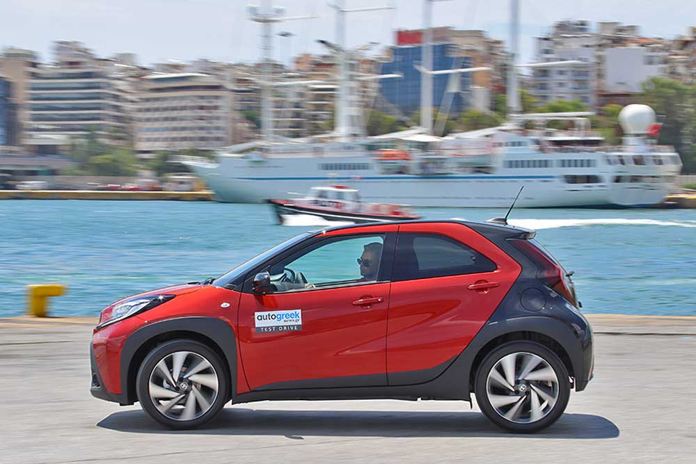 Ο νεανικός σχεδιασμός του νέου Toyota Aygo X, είναι ένα από τα βασικά γνωρίσματα που προσελκύουν το κοινό. Αν και σε κάποια σημεία θυμίζει το προγενέστερο Aygo, πρόκειται για ένα εντελώς νέο αυτοκίνητο, βασισμένο στην πλατφόρμα του νέου Yaris και με εμφανώς μεγαλύτερες διαστάσεις παντού (μήκος 3.700 χιλιοστά). Αντίστοιχα και το εσωτερικό έχει διατηρήσει εν μέρει τη φιλοσοφία του προκατόχου του με τις «γυμνές» μεταλλικές επιφάνειες, όμως είναι σαφώς πιο σύγχρονο και με εξοπλισμό που θα βρει κανείς σε μεγαλύτερα αυτοκίνητα. Τα υλικά στο ταμπλό είναι σκληρά μεν, αλλά η συναρμολόγηση είναι πολύ καλή. Σχετικά με τους χώρους, οι εμπρός επιβάτες κάθονται άνετα, ενώ στο πίσω κάθισμα ο αέρας για τα πόδια είναι οριακός και την είσοδο – έξοδο δεν διευκολύνει το μικρό άνοιγμα των θυρών. Για τις αποσκευές τα 231 λίτρα ικανοποιούν για τα δεδομένα της κατηγορίας.