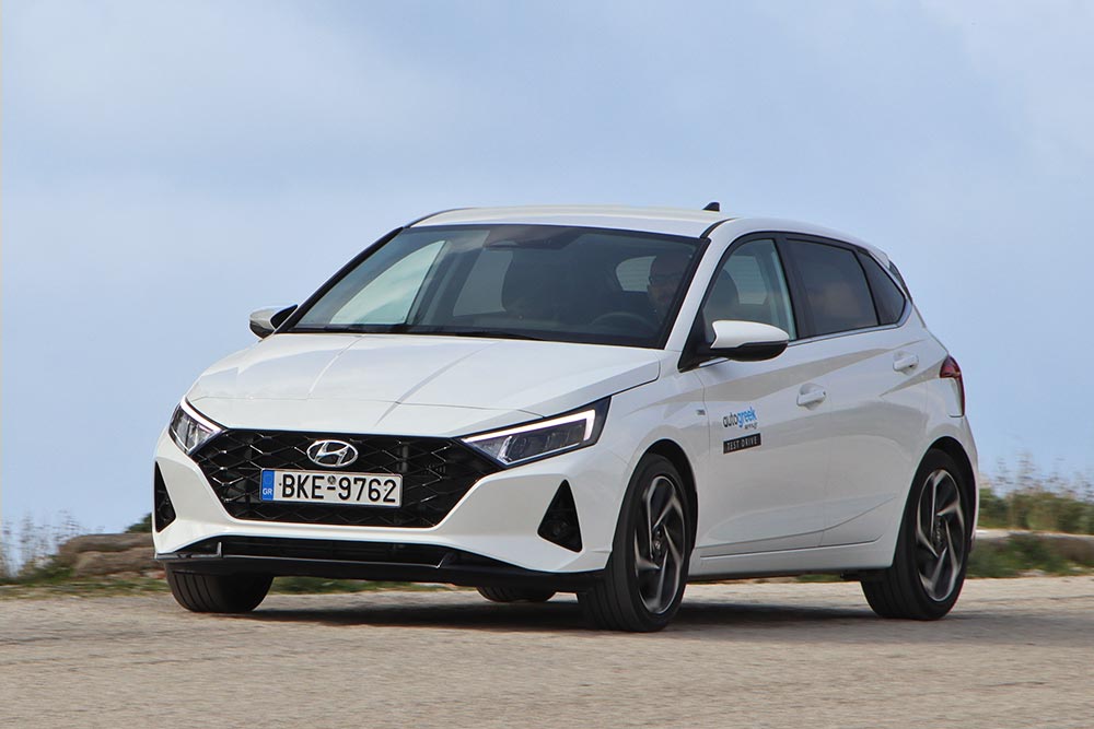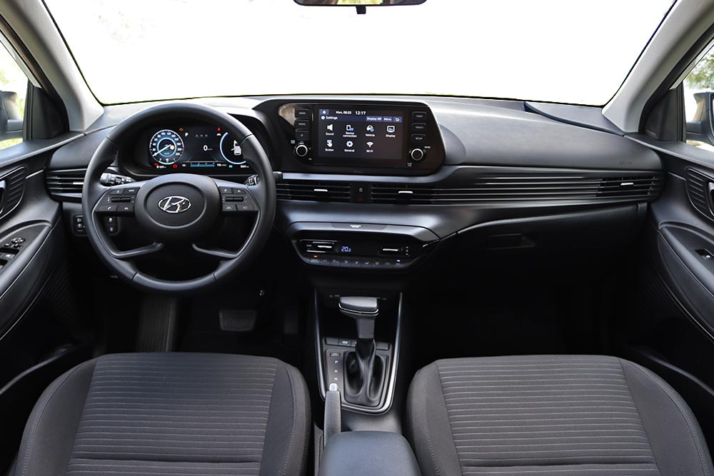 Γεροδεμένο είναι και το εσωτερικό του, όπου όλες οι επιφάνειες των σκληρών πλαστικών στο ταμπλό, κονσόλα και πόρτες μοιάζουν πακτωμένες και αποτρέπουν εμφάνιση τυχόν ενοχλητικών τριγμών. Στα θετικά γνωρίσματα της καμπίνας ανήκουν ακόμα ο μοντέρνος σχεδιασμός και η πολύ καλή εργονομία. Μεγάλο ατού του i20 είναι και η ευρυχωρία που απολαμβάνουν ακόμα και οι πιο ψηλοί επιβάτες. Τέλος, το πορτ μπαγκάζ των 262 λίτρων ικανοποιεί, ωστόσο λόγω της μπαταρίας κάτω από το δάπεδο είναι μικρότερο κατά 90 λίτρα έναντι των μη υβριδικών i20.