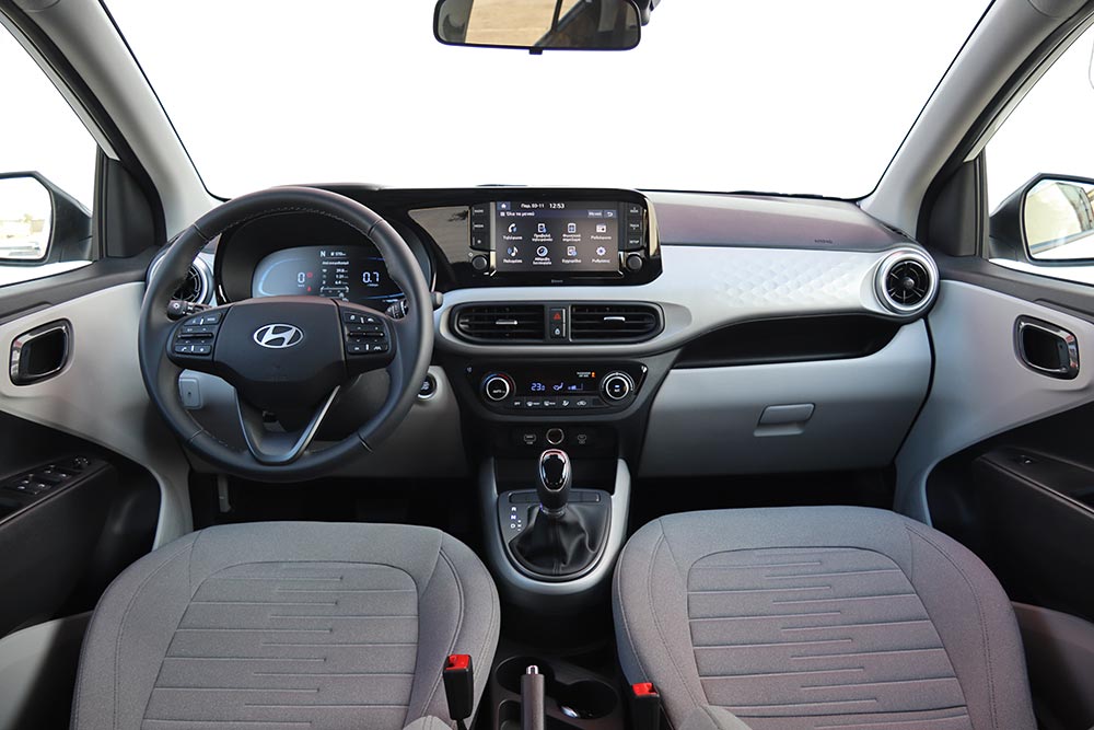 Παρότι μίνι αυτοκίνητο με μήκος 3.670 χλστ., πλάτος 1.680 χλστ., ύψος 1.480 χλστ. και μεταξόνιο 2.425 χλστ., οι χώροι στο εσωτερικό του αποτελούν μια έκπληξη. Ακόμα και ψηλοί επιβάτες δεν θα συναντήσουν πρόβλημα με τον αέρα για τα πόδια και το κεφάλι τους. Επίσης, το πορτ μπαγκάζ των 252 λίτρων είναι από τα μεγαλύτερα της κατηγορίας. Στα πολύ θετικά γνωρίσματα στο εσωτερικό του νέου Hyundai i10 ανήκει η πολύ καλή εργονομία και η γεροδεμένη του κατασκευή, όπου τα συμπαγή σκληρά πλαστικά είναι πολύ καλά συναρμολογημένα και αποτρέπουν τυχόν εμφάνιση τριγμών.