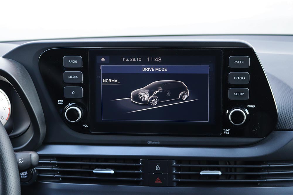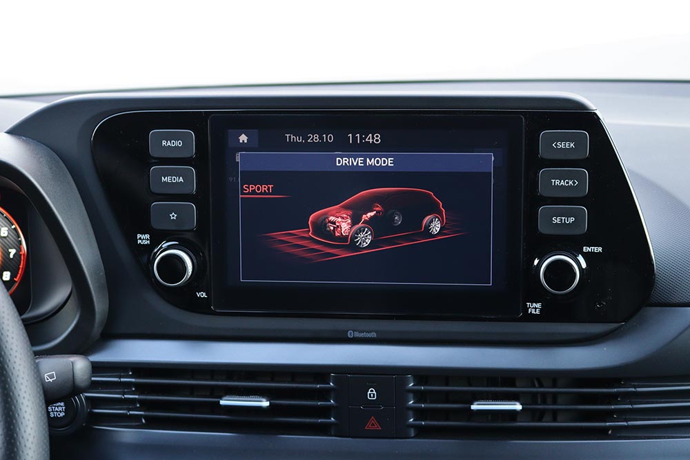 Η ουσία της οδήγησης στο τιμόνι του i20 N Performance Pack, βρίσκεται εκεί που υπάρχουν ορεινές διαδοχικές στροφές. Το μεγάλο κρυφό χαρτί του N Performance Pack είναι το μηχανικό μπλοκέ διαφορικό N Corner Carving Differential, γιατί δεν αφήνει το αυτοκίνητο να πετάξει μούτρα, ακόμα και με πατημένο τέρμα το γκάζι μέσα στη στροφή. Εκεί το αυτοκίνητο ακολουθεί τις εντολές του οδηγού με ακρίβεια χάρακα και βγαίνει από τη στροφή με τους κινητήριους τροχούς να πατάνε εντός της στροφής και όχι να σπινάρουν άσκοπα. Σύμμαχός του είναι το ακριβές και με πολύ καλή αίσθηση τιμόνι, ενώ σε κάθε περίπτωση οι επιλογές Eco, Normal, Sport, N και N Custom διαμορφώνουν την απόκριση του κινητήρα, τις ρυθμίσεις του ESC, τον ήχο της εξάτμισης και το βάρος του συστήματος διεύθυνσης.