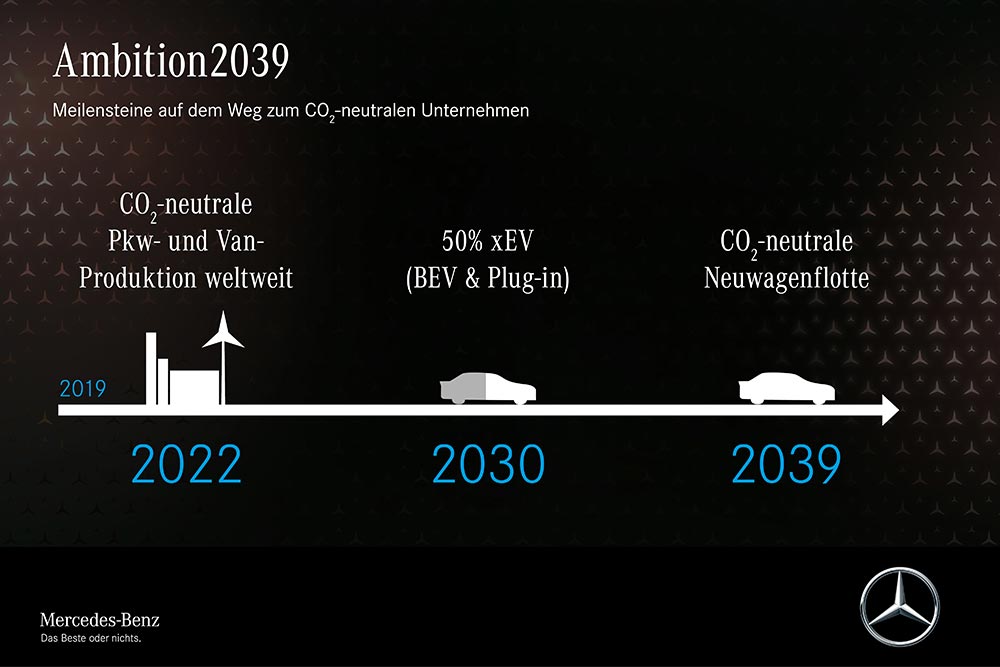 Με την ονομασία Ambition 2039, έχει «βαφτίσει» η Mercedes την νέα «οικολογική» επιχειρηματική στρατηγική της. Μέσω του Ambition 2039, η Mercedes θα δημιουργήσει έναν ενεργειακά ουδέτερο και τεχνολογικά προηγμένο στόλο οχημάτων το 2039, έντεκα χρόνια νωρίτερα απ’ ό,τι ορίζει η νομοθεσία της Ευρωπαϊκής Ένωσης. Το πλάνος της Mercedes θέλει ο μισός στόλος πωλήσεων επιβατικών αυτοκινήτων έως και το 2030 να είναι plug-in υβριδικά ή ηλεκτρικά οχήματα! Ο επόμενος μεγάλος στόχος της μάρκας είναι η carbon neutral παραγωγή και μάλιστα από την επόμενη κιόλας χρονιά.