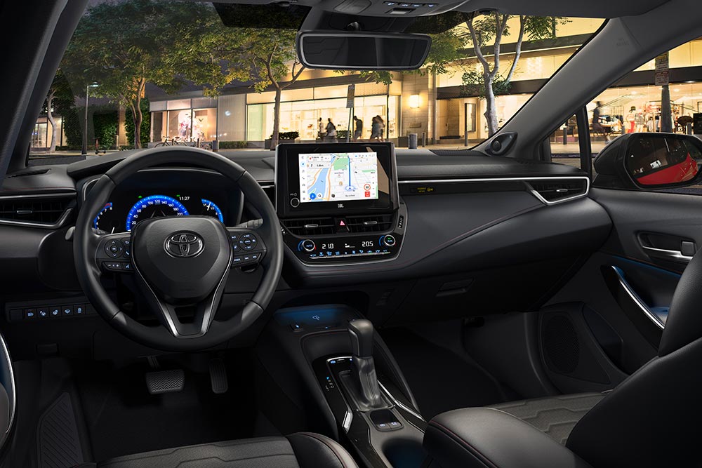 Πολύ καλές κριτικές αποσπά και το εσωτερικό του Corolla Hybrid, ως προς το μοντέρνο σχεδιασμό του και την προσεγμένη ποιότητα. Αυτή αναβαθμίζεται από τη χρήση παχιού αφρώδους υλικού με ραφές σε ολόκληρη σχεδόν την επιφάνεια του ταμπλό και σε ένα μέρος των θυρών. Παράλληλα, η εύχρηστη οθόνη των 8 ιντσών του συστήματος πολυμέσων ToyotaTouch 2 και η οθόνη TFT 7 ιντσών στον πίνακα οργάνων τονίζουν την σύγχρονη τεχνολογία του αυτοκινήτου. Εκεί που βρίσκεται στο μέσο όρο και προς τα κάτω, είναι σε χώρους. Στο πίσω κάθισμα ο αέρας για τα πόδια είναι λίγος παρά τα 4.370 χλστ. μήκους του Corolla, ενώ το πορτ μπαγκάζ των 361 λίτρων είναι αντίστοιχο με μικρών μοντέλων.