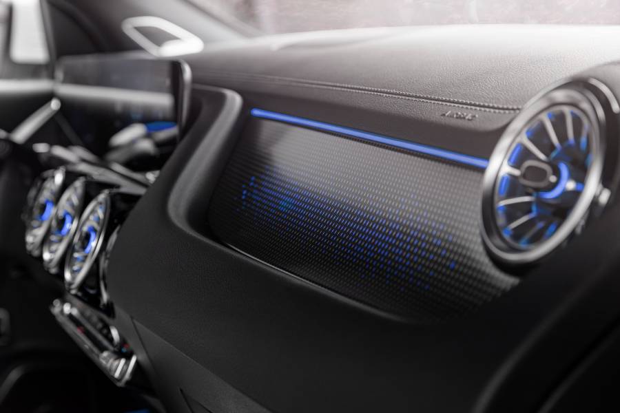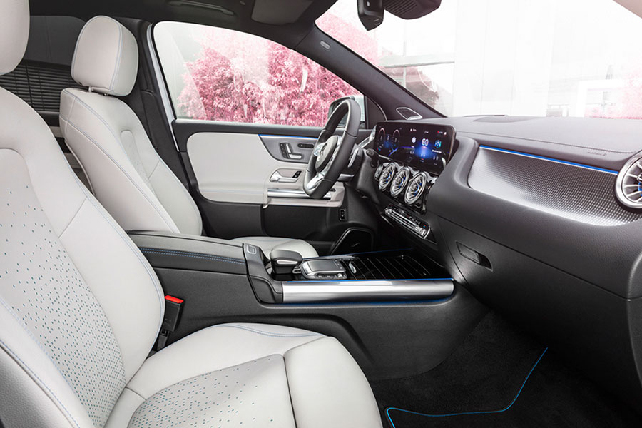 Γνώριμη γιατί είναι πανομοιότυπη με της GLA και πολυτελής γιατί πολύ απλά είναι Mercedes! Συγκριτικά με το θερμικό μοντέλο, υπάρχουν αλλαγές στις επενδύσεις, στα σήματα και τα γραφικά του συστήματος πολυμέσων. Η εντυπωσιακή οθόνη του MBUX, αλλά και του ψηφιακού πίνακα οργάνων που αμφότερες αγγίζουν τις 7 ίντσες, αλλά στον προαιρετικό εξοπλισμό είναι διαθέσιμες μεγαλύτερης διάστασης, 10,25 ιντσών εκάστη. Επίσης προαιρετικά, ο χώρος του ταμπλό μπροστά από τον συνοδηγό μπορεί να εξοπλιστεί με οπτικές ίνες, που χαρίζουν μια μοναδικά high tech εμφάνιση.