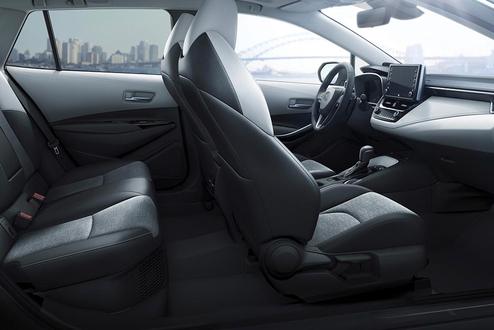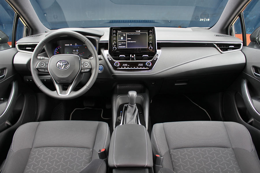 Τις δυναμικές γραμμές του αμαξώματος ακολουθεί και το εσωτερικό του Corolla Hybrid, όπου δίχως να υπάρχουν περιττά στοιχεία εντυπωσιασμού κερδίζει τις εντυπώσεις με τη συνολική του εικόνα σε κάθε επίπεδο. Στο κέντρο του ταμπλό κυριαρχεί η οθόνη αφής των 8 ιντσών και με κουμπιά για καλύτερο χειρισμό των διαφόρων λειτουργιών. Την ποιότητα αναβαθμίζει σημαντικά το παχύ αφρώδες υλικό που καλύπτει ολόκληρο το ταμπλό, καθώς και η επένδυση με δερματίνη και τις ραφές. Στον τομέα των χώρων, το δημοφιλές ιαπωνικό χάτσμπακ θα ικανοποιήσει μια τετραμελή οικογένεια χωρίς περίσσιες ανέσεις στο πίσω κάθισμα. Καλή χωρητικότητα έχει το πορτ μπαγκάζ των 361 λίτρων, αν και το σχήμα του δεν είναι πλήρως εκμεταλλεύσιμο.