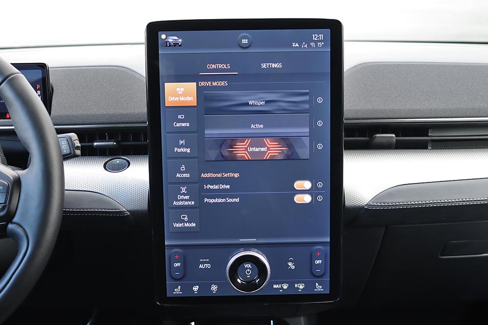 Το πρόγραμμα Active συνδυάζει την αθόρυβη λειτουργία ενός αμιγώς ηλεκτρικού οχήματος με απολαυστικές επιδόσεις, καθιστώντας το ιδανικό για καθημερινή οδήγηση. Αν ο οδηγός θέλει να γευτεί το σπορ χαρακτήρα της Mach-E, τότε το προφίλ Untamed είναι το ιδανικό, ενισχύοντας την αίσθηση από το τιμόνι και την απόκριση του γκαζιού. Επιπρόσθετα, στο πρόγραμμα αυτό ο οδηγός έχει την αίσθηση του κατεβάσματος ταχυτήτων κατά τη διαδικασία της επιβράδυνσης, με τον ενισχυμένο ήχο που φτάνει στο εσωτερικό να είναι ανάλογος των επιδόσεων. Κάνοντας το τιμόνι ελαφρύτερο, την απόκριση του γκαζιού πιο ήπια και το περιβάλλον της καμπίνας πιο αθόρυβο, το πρόγραμμα Whisper προσφέρει ήρεμη εμπειρία ταξιδιού με τη Mustang Mach-E. Το Whisper βελτιστοποιεί επίσης το σύστημα Traction Control που συνεισφέρει στη διατήρηση της πρόσφυσης σε βρεγμένες και ολισθηρές επιφάνειες.