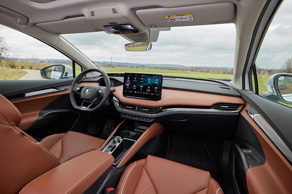 Πολύ θετική είναι η συνολική εικόνα που αποπνέει η καμπίνα του Enyaq iV. Εντυπωσιάζει η ποιότητα κατασκευής, μιας και γίνεται χρήση ποιοτικών υλικών, ενώ σε κορυφαίο επίπεδο βρίσκεται και κι η συναρμογή. Ξεχωρίζει η πολύ μεγάλη κεντρική οθόνη του συστήματος infotainment των 10 ή 13 ιντσών (ανάλογα την έκδοση), ενώ σύμφωνα με την τάση της εποχής, στην κεντρική κονσόλα είναι τοποθετημένα λίγα φυσικά κουμπιά. Στο βασικό εξοπλισμό ανήκει ο ψηφιακός πίνακας οργάνων με την οθόνη των 5,3 ιντσών, όπου προβάλλονται βασικές ενδείξεις για το αυτοκίνητο. Νέο στοιχείο στο εσωτερικό του Enyaq iV αποτελούν τα Design Selections για τη διαμόρφωση της καμπίνας, αντικαθιστώντας τα κλασσικά επίπεδα επένδυσης και ικανοποιώντας κάθε γούστο και ανάγκη. Οι χώροι για τους επιβάτες είναι πραγματικά τεράστιοι, με τους επιβάτες εμπρός και πίσω να κάθονται αρχοντικά. Πολύ μεγάλο με την σειρά του και πλήρως εκμεταλλεύσιμο είναι το πορτ μπαγκάζ των 585 λίτρων.