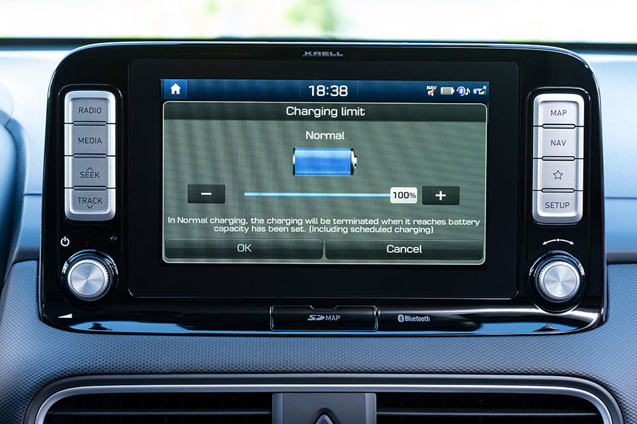 Η φόρτιση της μπαταρίας ιόντων λιθίου των 39kWh έως και το 80% της χωρητικότητάς της διαρκεί περίπου 54 λεπτά με τη χρήση ταχυφορτιστή συνεχούς ρεύματος (DC) 100 kW. Σε AC Wallbox 11 kW η φόρτιση 0-100% διαρκεί έως 6 ώρες και 10 λεπτά, ενώ σε απλή οικιακή πρίζα Schuko απαιτούνται 19 ώρες. Η θύρα φόρτισης βρίσκεται στη μάσκα του αυτοκινήτου, δίπλα στο λογότυπο Hyundai.