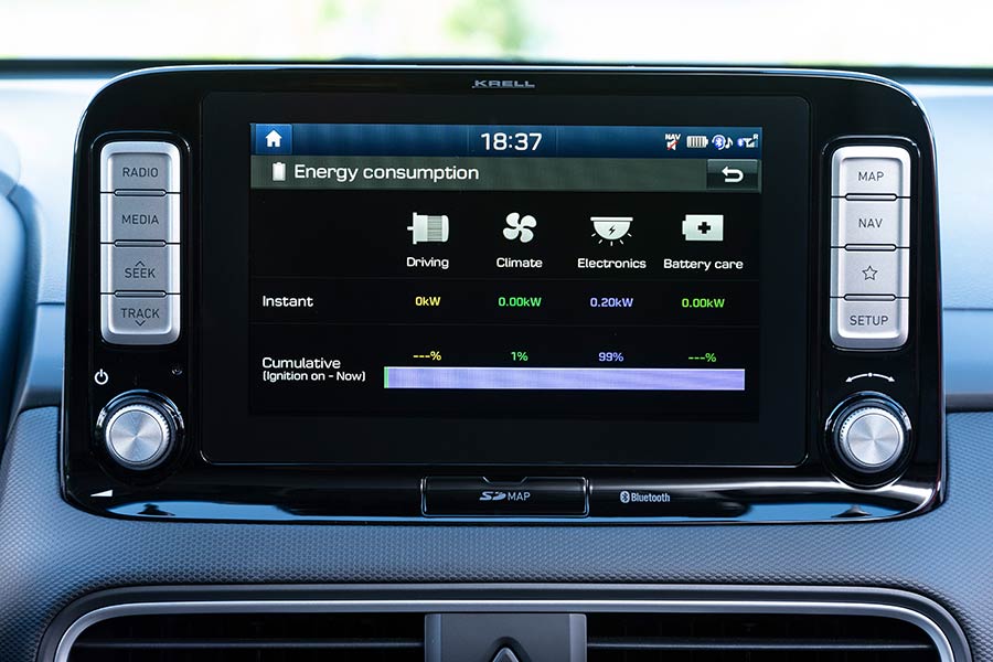 Στο εσωτερικό, η κεντρική κονσόλα/γέφυρα του Kona Electric συνδυάζει τα κουμπιά P, N, D και R με τον επιλογέα shift by wire, και ακριβώς από κάτω βρίσκεται ένας επιπλέον μεγάλος χώρος για προσωπικά αντικείμενα. Ο καινούργιος πλήρως ψηφιακός πίνακας οργάνων των 7,0 ιντσών εμφανίζει στοιχεία όπως ταχύμετρο, επίπεδο φόρτισης της μπαταρίας, ροή ενέργειας και επιλογή κίνησης. Το Kona Electric διαθέτει χώρο αποσκευών με χωρητικότητα που κυμαίνεται από 332 έως 1.114 λίτρα (VDA), καθιστώντας το ιδιαίτερα πρακτικό στην καθημερινή χρήση.