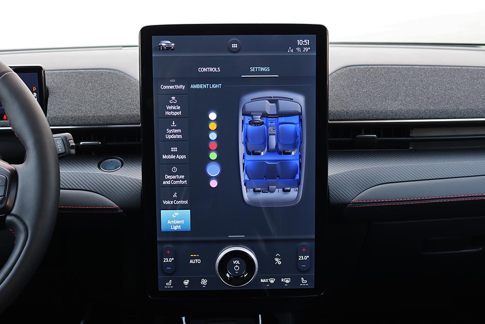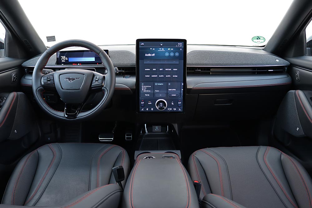 Οι άνθρωποι της Ford φρόντισαν να επιμεληθούν στο έπακρο το εσωτερικό της hi-tech Mustang Mach-E. Πέρα από τον τεχνολογικά προηγμένο χαρακτήρα της, η καμπίνα της έχει προσεγμένη ποιότητα, αποτελούμενη από στιβαρά υλικά, σωστά δεμένα μεταξύ τους. Εξίσου εντυπωσιακή είναι η αρχιτεκτονική του ταμπλό, με τη μεγάλη κεντρική οθόνη αφής των 15,5 ιντσών να σου γεμίζει το οπτικό πεδίο. Μέσω αυτής ελέγχεται το προηγμένο σύστημα πολυμέσων SYNC4, αλλά και το σύστημα του κλιματισμού. Ο οδηγός λαμβάνει την απαραίτητη πληροφόρηση από τον ψηφιακό πίνακα οργάνων με διάσταση 10,2 ιντσών.