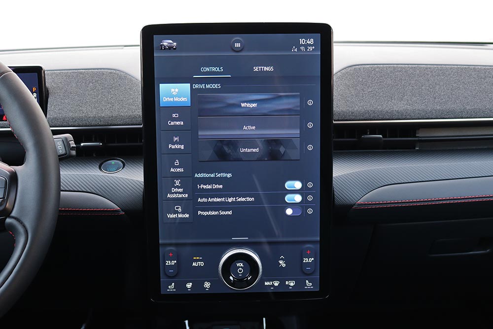 Σε κάθε είδους διαδρομή η Mach-E εμπνέει σιγουριά, κατορθώνοντας να είναι ευθύβολη και στα πολλά χιλιόμετρα, προσφέροντας παράλληλα πολύ καλή ποιότητα κύλισης, αλλά και ηχομόνωση. Παρά το σφιχτό set up και το αυξημένο βάρος, οι ανωμαλίες του οδοστρώματος μένουν εκτός, με τη Mach-E να περνάει ατάραχη πάνω από αυτές. Κι ανάλογα τα κέφια του οδηγού, μπορούν να επιλεγούν τρία διαφορετικά προφίλ οδήγησης, τα Whisper, Active και Untamed (είναι το πιο άγριο από τα τρία), που παραμετροποιούν ανάλογα την απόκριση του κινητήρα, αλλάζουν τον τεχνικό ήχο του μοτέρ και διαφοροποιούν τα γραφικά της οθόνης, καθώς επίσης και τον εσωτερικό φωτισμό.