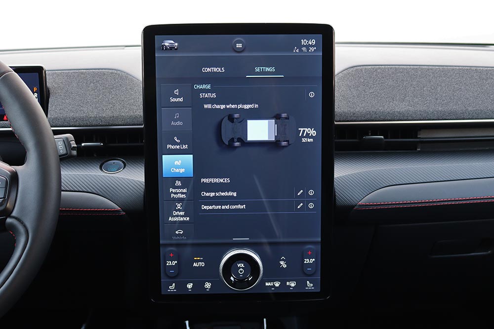 Με την μπαταρία των 88 kWh (καθαρή χωρητικότητα) προσφέρει αυτονομία που αγγίζει τα 540 χιλιόμετρα. Σε ότι αφορά τη φόρτιση τώρα, σε wallbox των 7,4 kW απαιτούνται 13-17 ώρες για να φτάσει η μπαταρία από το 10 στο 80%, ενώ σε τριφασικό wallbox των 11 kW απαιτούνται 6-7 ώρες. Εντυπωσιακή είναι και η κατανάλωση, αφού χρειάζεται 18,7 kWh/100 χλμ., τα οποία ισοδυναμούν με περίπου 3 ευρώ/100 χλμ.! Και δεν απαιτείται να είστε μέσα στη Mach-E για να βλέπετε τα επίπεδα της μπαταρίας, αφού με την εφαρμογή FordPass, οι ιδιοκτήτες της Mustang Mach-E μπορούν να έχουν απομακρυσμένη πρόσβαση στις πληροφορίες για τη φόρτιση της μπαταρίας και την υπολειπόμενη αυτονομία του αυτοκινήτου, αλλά και να προγραμματίζουν τις επιθυμητές ώρες φόρτισης.