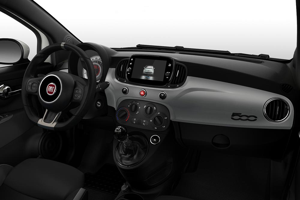 Όπως εξωτερικά, έτσι και στο εσωτερικό οι καμπύλες επιφάνειες και τα στρογγυλά σχήματα αφθονούν και του χαρίζουν μια πολύ όμορφη και νεανική εικόνα. Σε συνδυασμό με τις οθόνες των 7 ιντσών στον πίνακα οργάνων και του συστήματος πολυμέσων, η καμπίνα του 500 συνδυάζει το στιλ με την τεχνολογία. Στην οθόνη TFT του πίνακα οργάνων προβάλλονται πολλές λειτουργίες του αυτοκινήτου, όπως και η ροή ενέργειας, που δείχνει πώς λειτουργεί ο κινητήρας του ήπιου υβριδικού συστήματος. Στον τομέα της ποιότητας, στα σκληρά πλαστικά που έχουν χρησιμοποιηθεί είναι συμπαγή και έχουν καλή συναρμογή, με το διάκοσμο να ακολουθεί την «trendy» φιλοσοφία του αυτοκινήτου. Ο οδηγός του 500 κάθεται ψηλά (κάποιοι θα ήθελαν πιο χαμηλή θέση), ενώ σε πολύ βολική θέση βρίσκεται ο ψηλά τοποθετημένος λεβιές ταχυτήτων. Οι πιο ψηλοί και εύσωμοι, ίσως να νιώσουν στρυμωγμένοι λόγω της πλατιάς βάσης του κιβωτίου ταχυτήτων. Σε επίπεδο χώρων, το 500 προορίζεται ουσιαστικά για δύο ενήλικες, καθώς στο πίσω τμήμα της καμπίνας οι χώροι είναι περιορισμένοι. Ικανοποιητικό είναι για την κατηγορία των μίνι αυτοκινήτων το πορτ μπαγκάζ των 185 λίτρων με το μεγάλο άνοιγμα.
