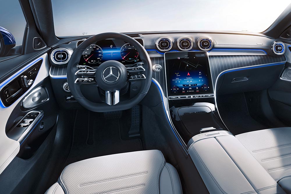 Ο λόγος για την καμπίνα της νέας Mercedes C-Class που από την πρώτη επαφή σου «κόβει» την ανάσα με τα όσα ενσωματώνει. Τι να πρωτοπούμε; Για την ποιότητα κατασκευής που είναι αψεγάδιαστη, για τα πολυτελή υλικά που αποτελείται, ή μήπως για τις ψηφιακές οθόνες για τον πίνακα οργάνων και το infotainment αντίστοιχα; Ξεκινώντας από την απαραίτητη πληροφόρηση του οδηγού, αυτός τη λαμβάνει από τον ψηφιακό πίνακα οργάνων που διαφοροποιείται ξεκάθαρα από τα παραδοσιακά cockpit με τα κλασικά, στρογγυλά όργανα, έχοντας στη διάθεσή του δυο επιλογές: μια έκδοση 10,25 ιντσών ή 12,3 ιντσών! Ο ψηφιακός και τεχνολογικός οργασμός συνεχίζεται στο κέντρο του ταμπλό που υπάρχει η κεντρική οθόνη αφής, η οποία επιτρέπει τον έλεγχο των λειτουργιών του αυτοκινήτου και μοιάζει να αιωρείται πάνω από την κονσόλα. Ως μια ενίσχυση του οδηγοκεντρικού χαρακτήρα της Mercedes C-Class, η οθόνη έχει ελαφριά κλίση προς τον οδηγό, με τη διαγώνιό της να ξεκινάει από τις 9,5 ίντσες και μπορεί να φτάσει έως και τις 11,9 ίντσες! Τα δύο άκρα του ταμπλό οργάνων πλαισιώνονται από τη σύγχρονη, εξαιρετικά λιτή σχεδίαση των επενδύσεων των θυρών. Η κεντρική επένδυση της πόρτας με ενσωματωμένο υποβραχιόνιο μετατρέπεται από κάθετη σε οριζόντια επιφάνεια. Αντανακλώντας τη σχεδίαση της κεντρικής κονσόλας, το μπροστινό τμήμα αποκτά τη μορφή ενός high-tech μεταλλικού στοιχείου, που μπορεί να χρησιμοποιηθεί ως χειρολαβή και περικλείει τα χειριστήρια των ηλεκτρικών παραθύρων.