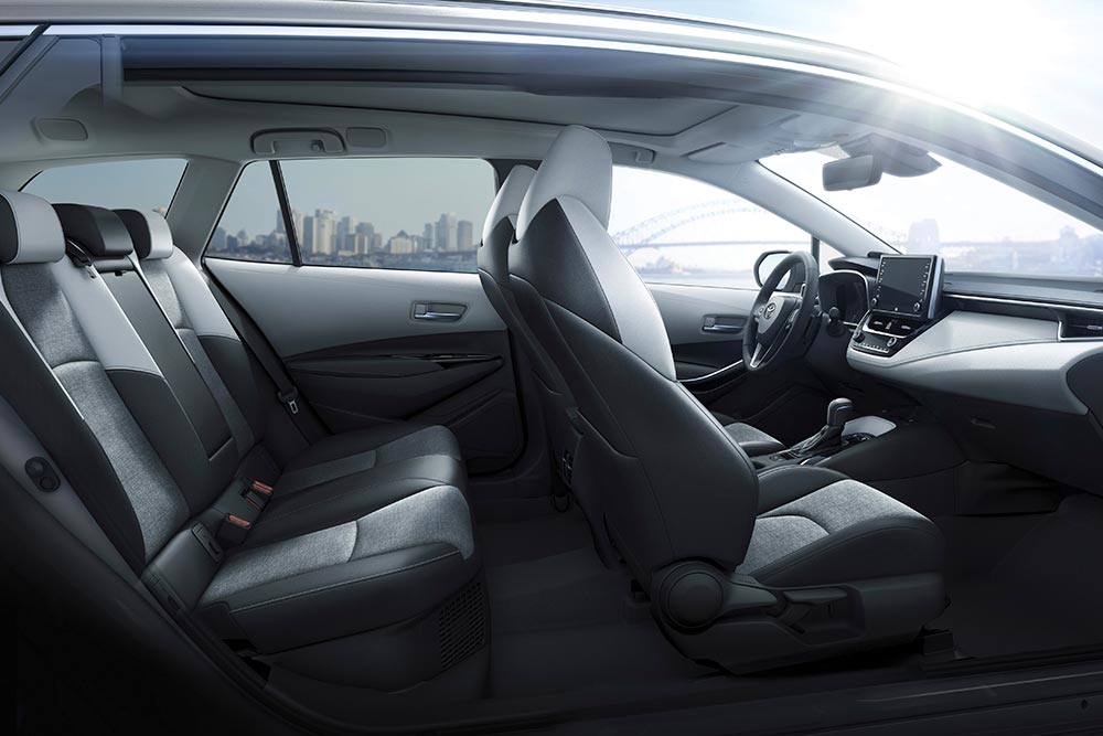 Στο μοντέρνο και πολύ καλής ποιότητας εσωτερικό του Corolla Touring Sports θα βολευτούν χαλαρά τέσσερα ενήλικα άτομα, ενώ το χαμηλό κεντρικό τούνελ θα διευκολύνει έναν ακόμα. Επίσης, στο πίσω κάθισμα ο αέρας για τα γόνατα είναι πολύς, εν αντιθέσει με του χάτσμπακ που είναι σχετικά λίγος.