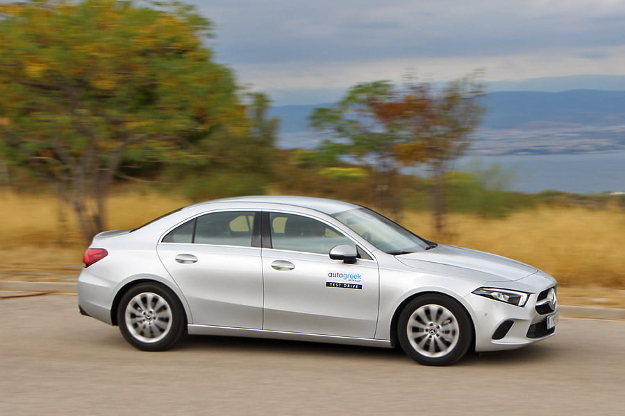 Σαφώς η sedan έκδοση της A-Class ασπάζεται την αιχμηρή σχεδιαστική ταυτότητα της μάρκας που ξεχωρίζει με το δυναμισμό της. Το χαμηλό ρύγχος με τους λεπτούς προβολείς και το LED περίγραμμα σου τραβούν το βλέμμα, όπως και η μεγάλη εξάγωνη μάσκα. Με εξαιρετικό τρόπο οι σχεδιαστές προσάρμοσαν τον τρίτο όγκο, όπου η ενώνεται πολύ όμορφα με το κεκλιμένο παρμπρίζ και το καπό, παραπέμποντας στα 4θυρα κουπέ. Ένα ακόμα μοναδικό της χαρακτηριστικό, είναι ο πάρα πολύ χαμηλός αεροδυναμικός συντελεστής, Cd: 0,22. Επίσης, το μήκος του αμαξώματος φτάνει τα 4.549 χλστ. και είναι μεγαλύτερο κατά 130 χλστ. από την 5θυρη A-Class.