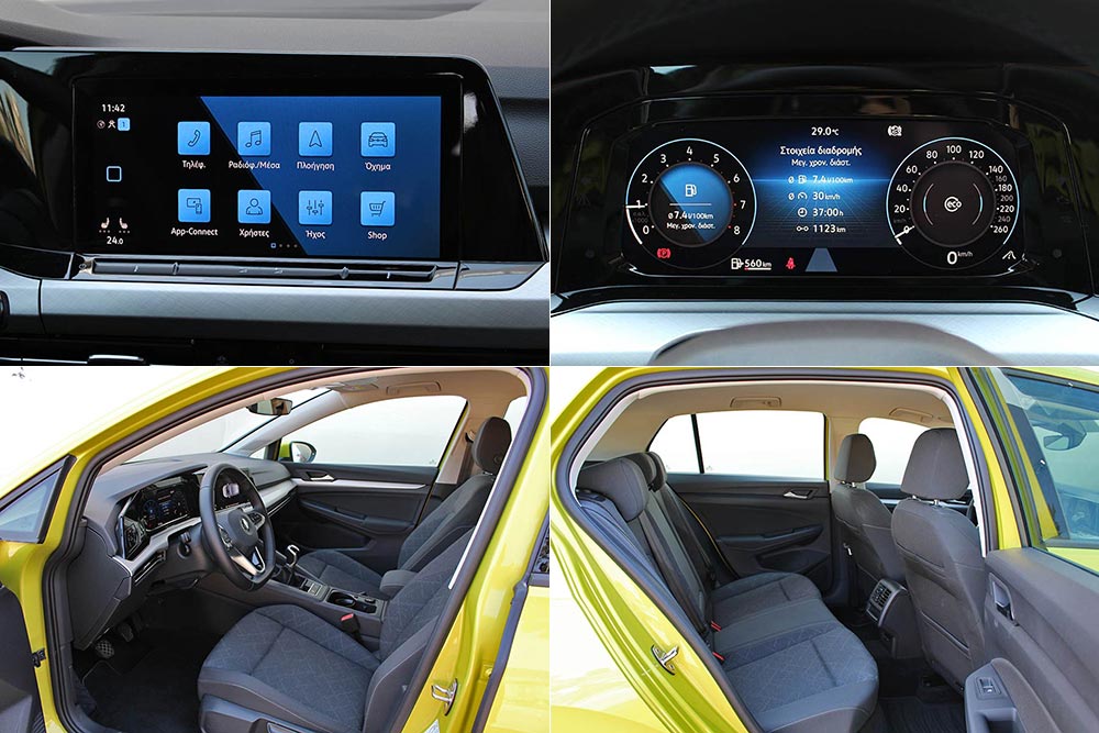 Εκτός από τον φουλ στάνταρ εξοπλισμό, το Golf διακρίνεται και για την προσοχή που έχει δοθεί στην κατασκευή του. Η ποιότητα των υλικών βρίσκεται σε κορυφαίο επίπεδο, με χορταστικό αφρώδες πλαστικό να χρησιμοποιείται στην μεγαλύτερη επιφάνεια ταμπλό και θυρών. Παράλληλα οι δύο ψηφιακές οθόνες το αναβαθμίζουν πολύ τεχνολογικά, αν και τα χειριστήρια αφής θέλουν εξοικείωση. Από χώρους δεν υπάρχει παράπονο, καθώς στο πίσω μέρος υπάρχει πολύς αέρας για τα πόδια, ενώ το πορτμπαγκάζ των 381 λίτρων ικανοποιεί με την χωρητικότητα και το σχήμα του.