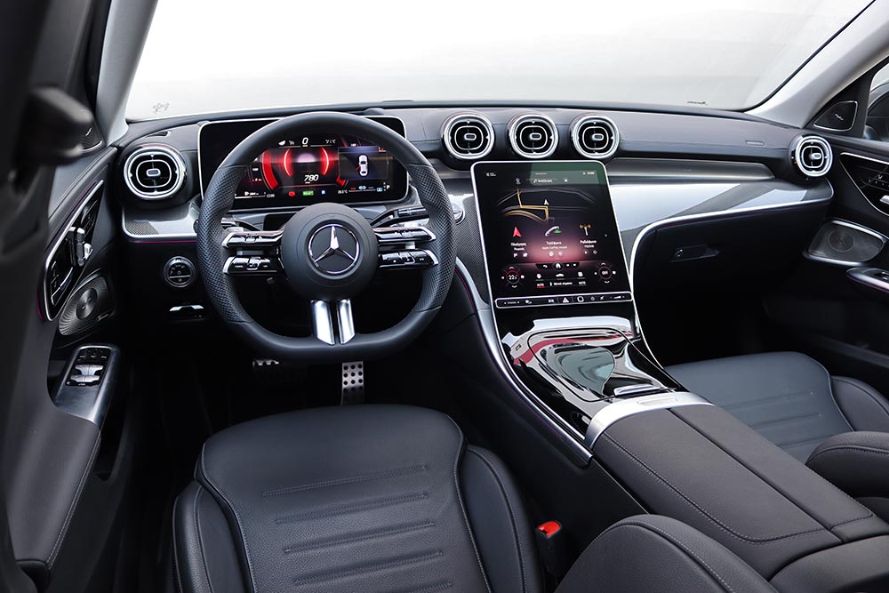 Όσο κλισέ κι αν σας φαίνεται ο παραπάνω τίτλος, είναι κάτι που απεικονίζει στο 100% την πραγματικότητα για την καμπίνα της C-Class, αφού υιοθετεί πολλά από τη ναυαρχίδα της μάρκας. Ότι και να πούμε για την ποιότητα είναι λίγο, μιας και κάθε εκατοστό στο εσωτερικό της C-Class σου αποκαλύπτει την premium υπόσταση του μοντέλου, σε συνδυασμό με την υψηλή τεχνολογία. Εντυπωσιακό είναι το ταμπλό που πλέον είναι χωρισμένο σε δύο τμήματα, με το επάνω να ενσωματώνει τους νέους στρογγυλούς αεραγωγούς, ενώ κάτω υπάρχει μια ενιαία επιφάνεια με πολυτελή διακοσμητικά στοιχεία, η οποία εκτείνεται ομοιόμορφα από την κεντρική κονσόλα. Ο οδηγοκεντρικός χαρακτήρας της C-Class ενισχύεται από την ελαφριά κλίση έξι μοιρών που έχουν προς τον οδηγό το ταμπλό οργάνων και η κεντρική οθόνη! Ο ψηφιακός χαρακτήρας του γερμανικού sedan ενισχύεται με την κεντρική, OLED οθόνη αφής, η οποία επιτρέπει τον έλεγχο επιμέρους λειτουργιών της C-Class και μοιάζει να αιωρείται. Οι δύο μεγάλες αυτές οθόνες έχουν η μεν του οδηγού διαγώνιο 12,3 ιντσών (31,2 εκ.), η δε κεντρική οθόνη 11,9 ιντσών (30,2 εκ.) και περιλαμβάνονται και οι δύο στο βασικό εξοπλισμό του αυτοκινήτου.