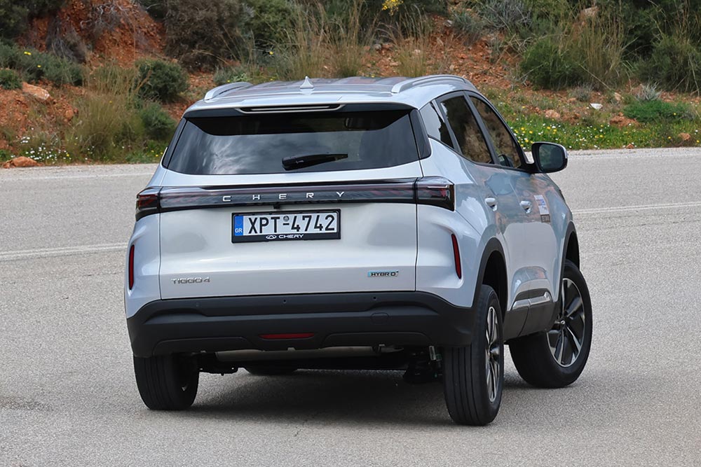 Το νέο Tiggo 4 Hybrid με μήκος 4.320 χλστ., πλάτος 1.831 χλστ., ύψος 1.653 χλστ. και μεταξόνιο 2.610 χλστ. είναι από τα πιο μεγάλα B-SUV, ωστόσο είναι ένα πολύ ευέλικτο και εύκολο στην οδήγηση αυτοκίνητο. Από τα πρώτα κιόλας χιλιόμετρα ο οδηγός αντιλαμβάνεται τη στιβαρότητα του πλαισίου (θυμίζει τα αμιγώς ηλεκτρικά). Οι αναρτήσεις με την σχετικά σφιχτή ρύθμιση επιτυγχάνουν μια πολύ καλή ισορροπία μεταξύ άνεσης και κρατήματος στο δρόμο. Στους αυτοκινητόδρομους ταξιδεύει με ασφάλεια, ενώ σε διαδρομές με στροφές εμφανίζει λογικές κλίσεις και αυξημένα περιθώρια πρόσφυσης, ακόμα και σε ρυθμούς που δεν «ταιριάζουν» με το οικολογικό του προφίλ.