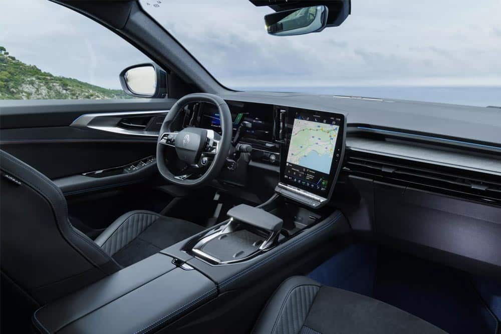 Στο εσωτερικό, το Rafale εκπέμπει κομψότητα και λειτουργικότητα, με ψηφιακές οθόνες OpenR Link. Ο ψηφιακός πίνακας οργάνων με διαγώνιο 12,3 ιντσών σε οριζόντια διάταξη και η κάθετη οθόνη αφής του συστήματος πολυμέσων με διαγώνιο 12 ιντσών διαμορφώνουν ένα περιβάλλον με διάταξη «L». Με το Android Automotive 12, το σύστημα πολυμέσων OpenR Link έχει ενσωματωμένες λειτουργίες της Google και πάνω από 50 εφαρμογές ανάλογα με τη χώρα και την έκδοση. Εκτός από τις δυνατότητες πλήρους εξατομίκευσης, το συγκεκριμένο interface είναι συμβατό με Android Auto και Apple CarPlay, για ενσύρματη και ασύρματη συνδεσιμότητα smartphone. Οι ανέσεις του Rafale όμως δεν περιορίζονται στο εμπρός μισό της καμπίνας, αφού οι πίσω επιβάτες απολαμβάνουν υποβραχιόνιο Ingenius με περιστρεφόμενες βάσεις για tablets και smartphones, καθώς και θύρες φόρτισης.