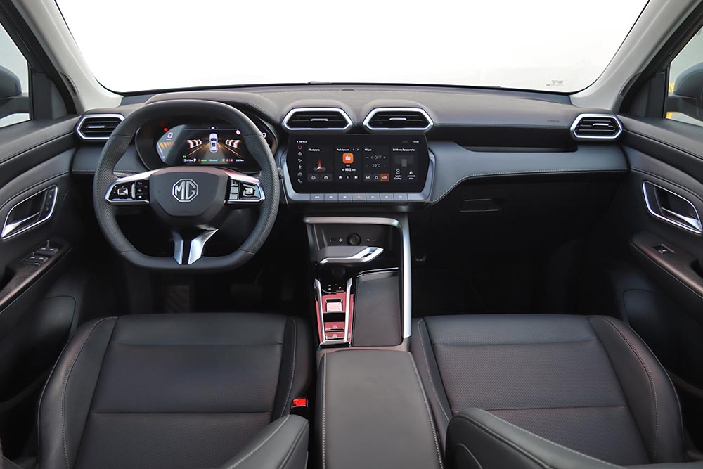 Στα πολύ σημαντικά ανταγωνιστικά πλεονεκτήματα του C-SUV της MG ανήκει το ιδιαίτερα αποδοτικό full hybrid σύνολο των 197 ίππων και 465 Nm ροπής. Από τη μία πλευρά εξασφαλίζει γρήγορες επιδόσεις και ηλεκτρική ώθηση, ενώ από την άλλη πλευρά οι απαιτήσεις του σε βενζίνη είναι χαμηλές. Ο ισχυρός ηλεκτροκινητήρας των 136 ίππων και 250 Nm ροπής λαμβάνει ενέργεια από την αυτοφορτιζόμενη μπαταρία των 1,83 kWh, εξασφαλίζοντας αμιγώς ηλεκτρική κίνηση για αρκετές αποστάσεις ειδικά στην πόλη και μέχρι την ταχύτητα των 87 χλμ./ώρα ή και περισσότερων ανάλογα με τις συνθήκες. Ο βενζινοκινητήρας των 1.5 λτ. κύκλου Atkinson αποδίδει 102 άλογα και 128 Nm ροπής και σε συνδυασμό με το ηλεκτρικό μοτέρ επιταχύνουν το αμάξωμα των 1.380 κιλών στο 0-100 χλμ./ώρα σε 8,7 δλ. Επίσης, ο οδηγός μέσω του μενού της κεντρικής οθόνης μπορεί να επιλέξει το βαθμό της ανάκτησης ενέργειας (ήπιο, μεσαίο και ισχυρό), όπου στην τρίτη περίπτωση θυμίζει αμιγώς ηλεκτρικό με λειτουργία one-Pedal. Σε αστικές συνθήκες η κατανάλωση βρίσκεται χωρίς κόπο στα 4,5 λτ./100 χλμ., ενώ σε μεικτή χρήση και πιο γρήγορους ρυθμούς μετρήσαμε μέχρι 5,9 λτ./100 χλμ. Επίσης, με εκπομπές CO2 113 γρ./χλμ. τα τέλη κυκλοφορίας είναι μηδενικά και η είσοδος στο Δακτύλιο επιτρέπεται καθημερινά.