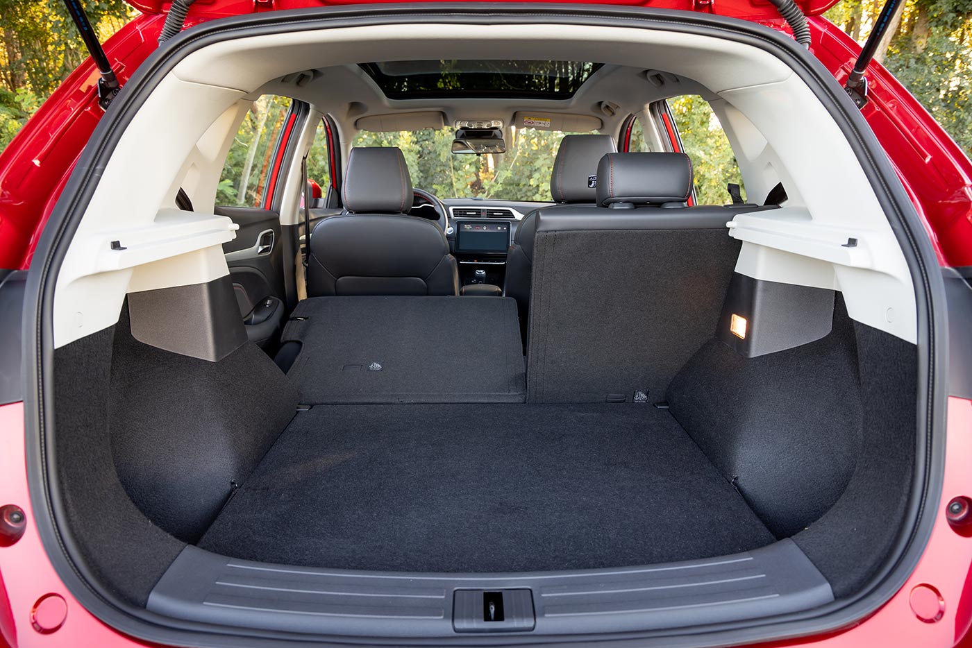 Το πληθωρικό (για μικρό SUV) και με σύγχρονο παρουσιαστικό MG ZS, μπορεί να προσφέρεται σε χαμηλές τιμές, όμως στο εσωτερικό του δεν γίνεται η παραμικρή υποχώρηση σε ποιότητα. Το αντίθετο θα λέγαμε ισχύει και το αντιλαμβάνεται άμεσα κανείς τόσο σε υλικά, όσο σε συναρμογή και φινίρισμα. Το παχύ μαλακό πλαστικό που καλύπτει το πάνω μέρος του ταμπλό, μαζί με τη μαλακή επένδυση στη μετωπική του επιφάνεια, τα συναντά κανείς σε πολύ ακριβότερα αυτοκίνητα. Ειδικά στην έκδοση Luxury των 20.550 ευρώ, οι επενδύσεις eco leather με τις κόκκινες ραφές προσθέτουν έξτρα πολυτέλεια σε τιμή «απλού» supermini αυτοκινήτου. Στα δυνατά σημεία του MG ZS ανήκουν και οι χώροι, οι οποίοι τοποθετούνται στο ανώτερο άκρο των B-SUV. Τέσσερις ενήλικες θα απλώσουν με απόλυτη άνεση τα πόδια τους, φιλοξενώντας και έναν ακόμα χωρίς ιδιαίτερα προβλήματα. Το πορτ μπαγκάζ ανέρχεται σε 448 λίτρα και χωράει πολλές αποσκευές.