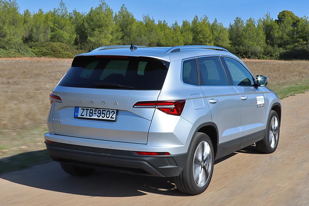Μετά την ανανέωση, το Skoda Karoq απέκτησε πιο μοντέρνα εμφάνιση εξωτερικά, ενώ στο εσωτερικό του οι αλλαγές αφορούν κάποιες τεχνολογικές αναβαθμίσεις και προσθήκη νέων επενδύσεων. Μεταξύ αυτών είναι το σύστημα Infotainment ΜΙΒ τρίτης γενιάς, με φωνητικό έλεγχο και ενημερώσεις λογισμικού over the air. Από πλευράς ποιότητας το μαλακό πλαστικό σε ολόκληρο το ταμπλό μέχρι και το μεσαίο τμήμα του και η στιβαρή συναρμογή δείχνουν την προσοχή στην κατασκευή του. Την πρακτικότητα ενισχύουν οι πολλές θήκες στην κονσόλα, στις πόρτες και ανάμεσα από τα εμπρός καθίσματα. Στον τομέα των χώρων το Skoda Karoq αριστεύει, παρόλο που είναι από τα πιο κοντά σε μήκος (4.390 χιλιοστά) C-SUV. Στο πίσω τμήμα υπάρχει αρκετό πλάτος, αέρας για τα πόδια και το κεφάλι, ακόμα και για τους πιο ψηλούς. Το μεγάλο πορτ μπαγκάζ έχει χωρητικότητα 521 λίτρα, ενώ με το προαιρετικό σύστημα VarioFlex με τα τρία συρόμενα, αναδιπλούμενα και αφαιρούμενα καθίσματα μεγαλώνει έως τα 588 λίτρα. Όταν πέσουν τα καθίσματα φτάνει έως τα 1.810 λίτρα.