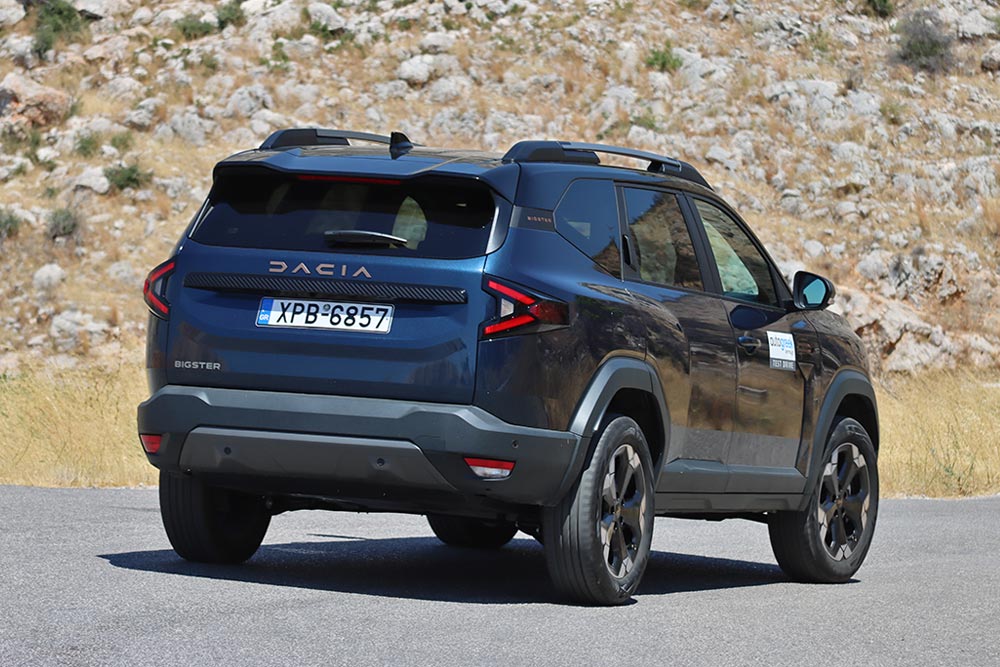 Το νέο Dacia Bigster είναι εμφανώς μακρύτερο από το μικρότερο αδελφάκι του το Duster στο οποίο βασίζεται, γεγονός που έχει ανάλογο αντίκτυπο σε χώρους. Το Bigster έχει μήκος 4.570 χλστ. (4.343 χλστ. το Duster), πλάτος 1.813 χλστ., ύψος 1.662 χλστ. (1.712 χλστ. με τις μπάρες οροφής) και μεταξόνιο 2.702 χλστ. (2.657 χλστ. το Duster). Το εκτεταμένο μεταξόνιο συμβάλλει στον πολύ αέρα για τα γόνατα που απολαμβάνουν οι φιλοξενούμενοι στο πίσω κάθισμα, αφού και ψηλοί δεν θα νιώσουν περιορισμένοι. Επίσης, το μακρύτερος πίσω πρόβολος των 1.014 χλστ. (828 χλστ. στο Duster) έχει μεγαλώσει ακόμα πιο πολύ το χώρο αποσκευών, φτάνοντας το εντυπωσιακό νούμερο των 702 λίτρων (κάτω από την εταζέρα) ή έως τα 2.002 λίτρα (!) έως την οροφή και με πεσμένες τις πίσω πλάτες (478/1.623 λτ. το Duster).