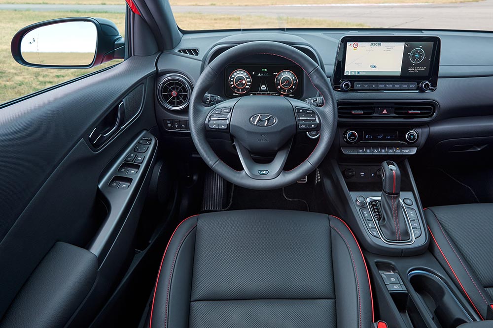Σπορ είναι η ατμόσφαιρα και στο θάλαμο των επιβατών του Kona N Line, με τις σε μαύρες επενδύσεις καθισμάτων από ύφασμα, δέρμα ή σουέτ και τις κόκκινες ραφές. Επιπλέον τα μεταλλικά πεντάλ και το λογότυπο N στο τιμόνι, στο λεβιέ ταχυτήτων και στα καθίσματα τονίζουν περεταίρω το δυναμισμό του αυτοκινήτου. Φουλ είναι και από πλευράς εξοπλισμού, μιας και διαθέτει στάνταρ 6 αερόσακους, συστήματα αυτόνομης πέδησης, διατήρησης λωρίδας και αυτόματης λειτουργίας προβολέων, ψηφιακό πίνακα οργάνων 10,25 ιντσών, οθόνη αφής 8 ιντσών, όλες τις ηλεκτρικές ευκολίες, αυτόματο κλιματισμό, ζάντες αλουμινίου N Line 18 ιντσών, κάμερα οπισθοπορείας, φώτα LED και πάρα πολλά ακόμη.